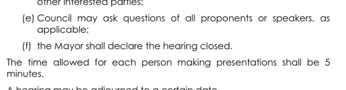 The proposed latest version of the bylaw reduces the time Council can be addressed from the present 10 minutes to five minutes.
