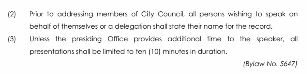 Excerpt from Bylaw #5176 allowing presenters m/presentations 10 minutes to address Council
