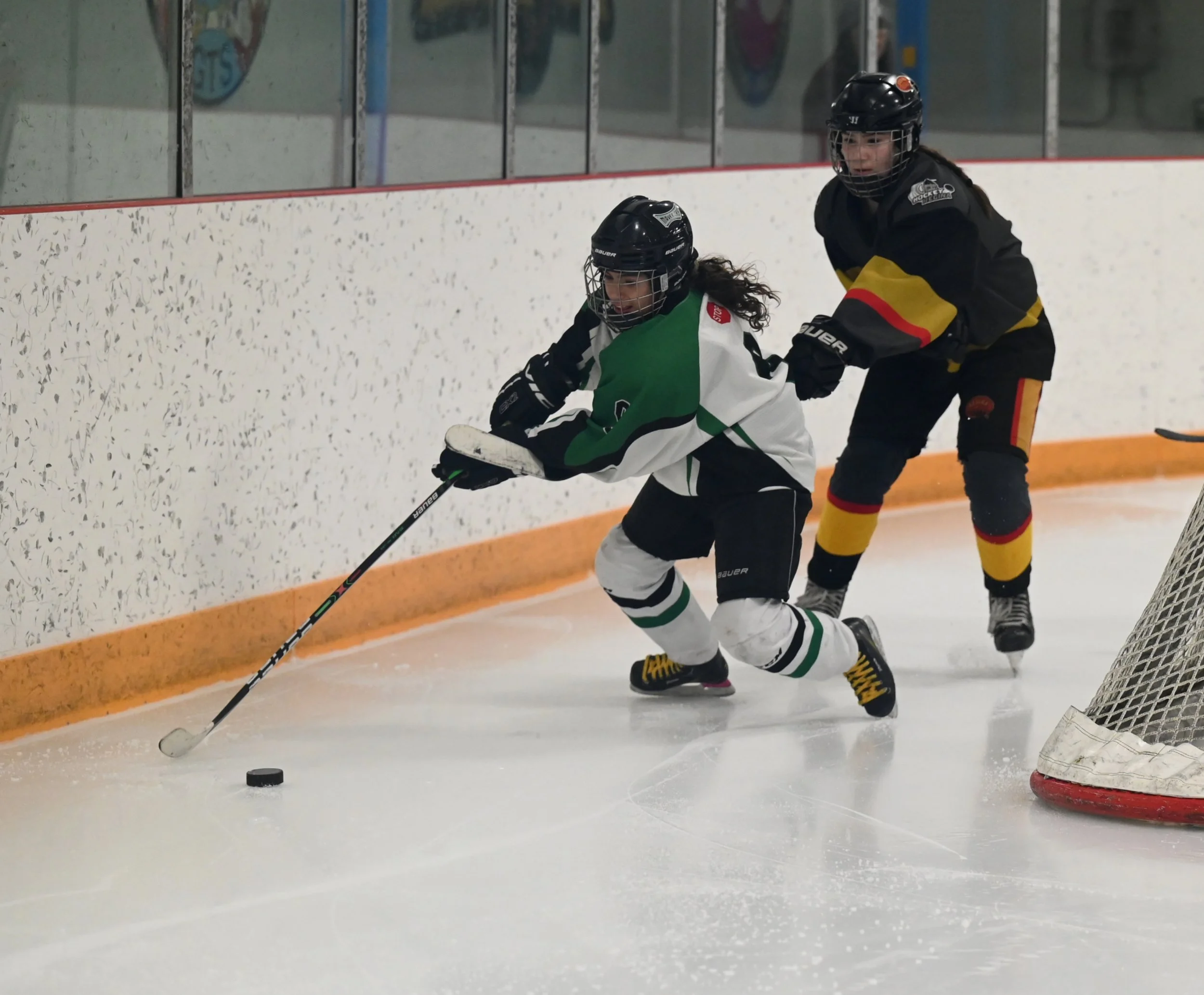 MOOSE JAW MAVERICKS MARIA UMANA EVADES A REGINA REBEL PLAYER IN HOT PURSUIT BEHIND THE MAVERICKS NET - MJ INDEPENDENT PHOTO
