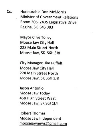 The letter was also sent to other media, Mayor Clive Tolley, the City Manager, the Minister Responsible Don McMorris and other media.