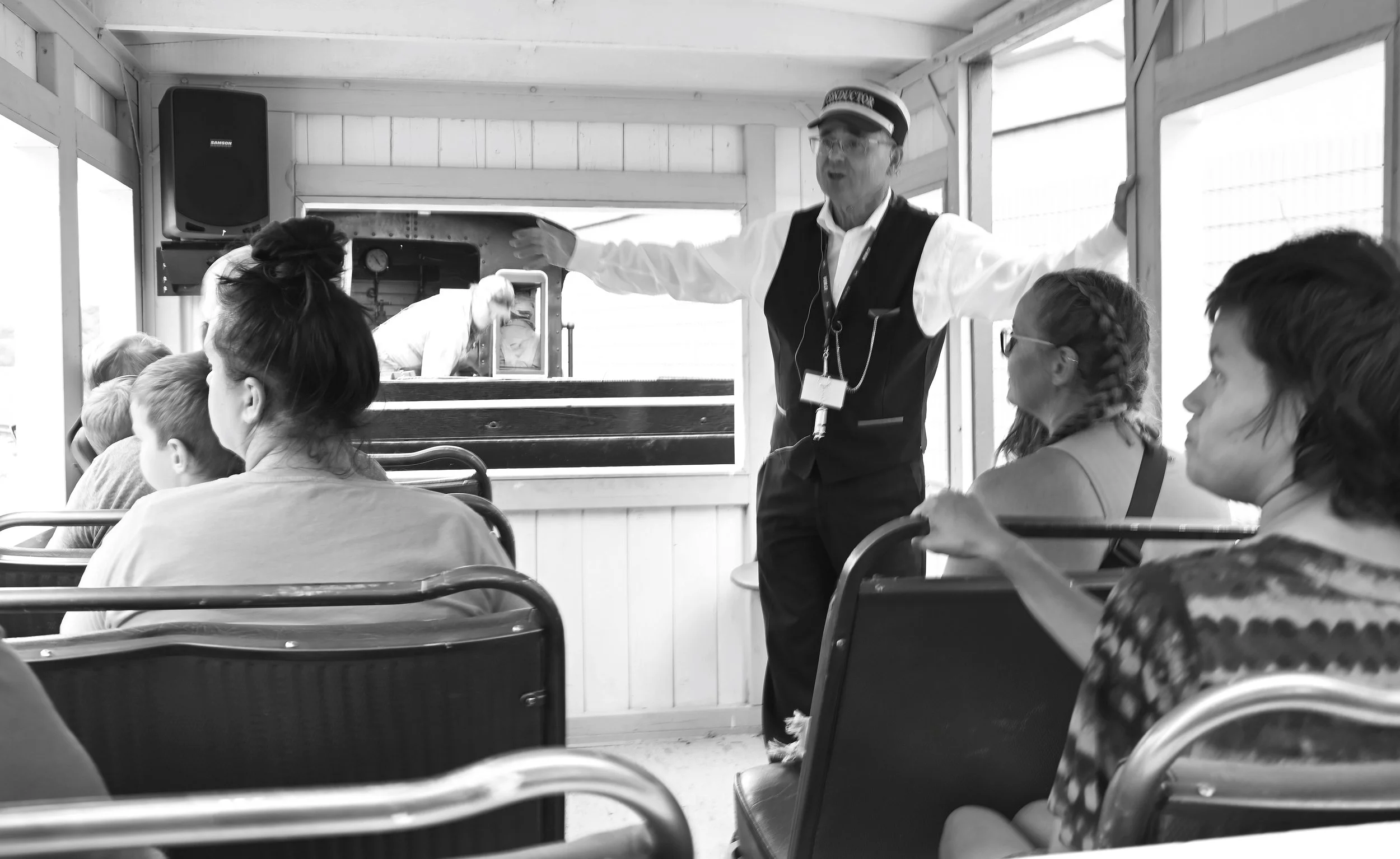 THE CONDUCTOR (TOP RIGHT) EXPLAINS THE MECHANICS OF TAKING A RIDE ON A STEAM LOCOMOTIVE - MJ INDEPENDENT PHOTO