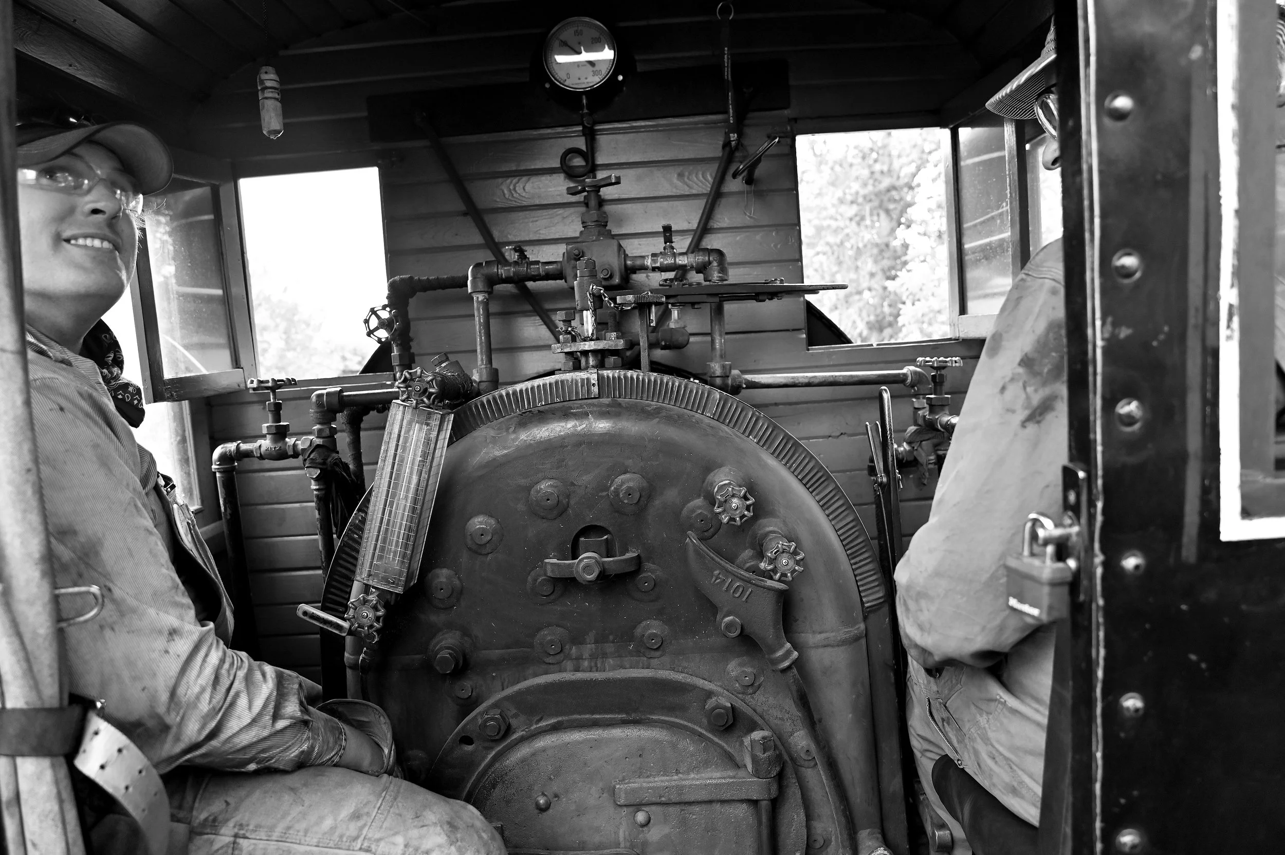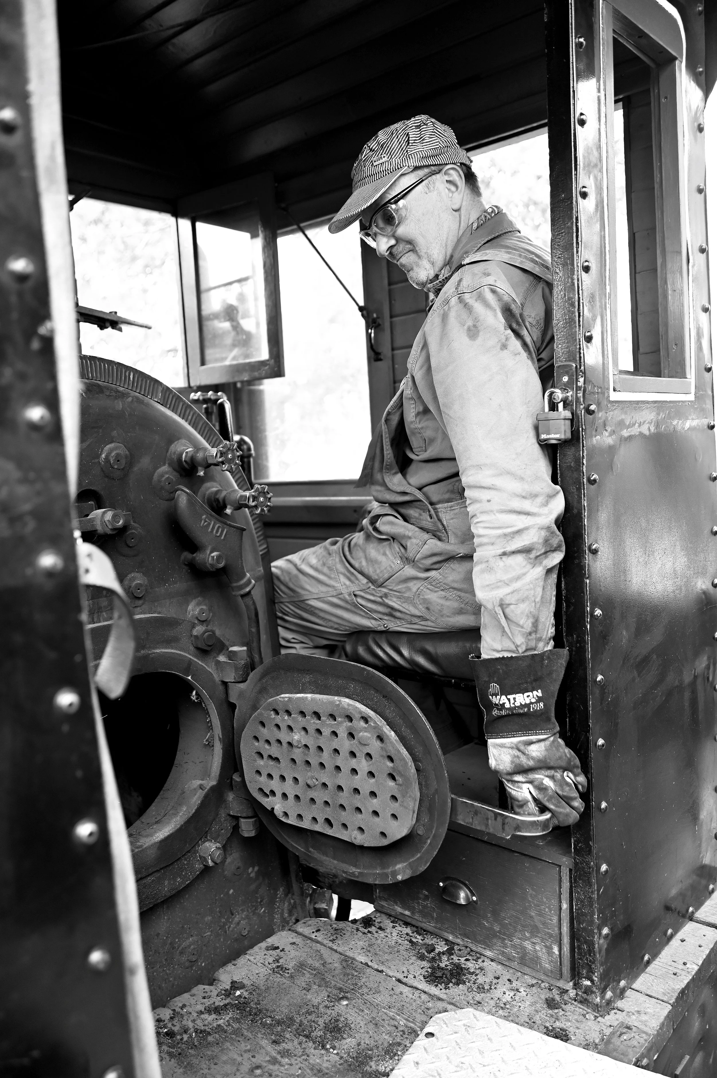 THE FIREMAN (LEFT) AND THE ENGINEER SIT READY FOR ANOTHER TRIP AS THE FIRE BOX IS FULL OF COAL AND THE TRAIN IS READY TO GO - MJ INDEPENDENT PHOTO