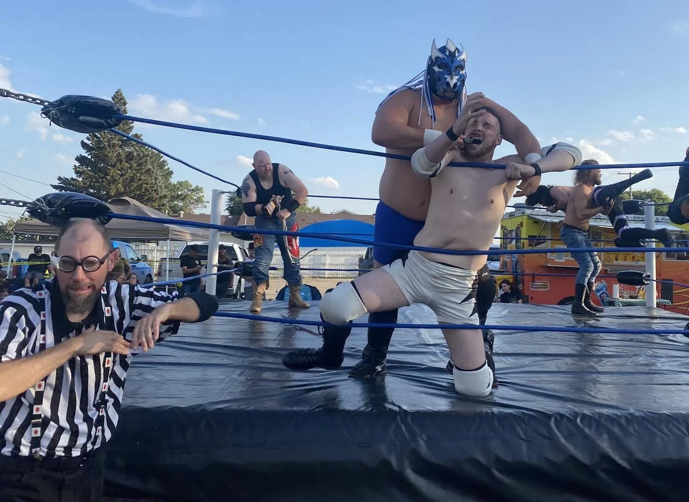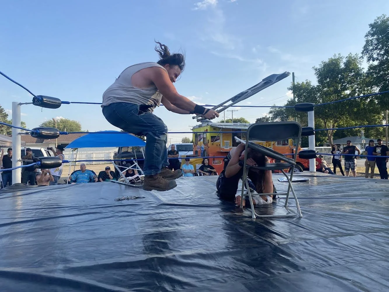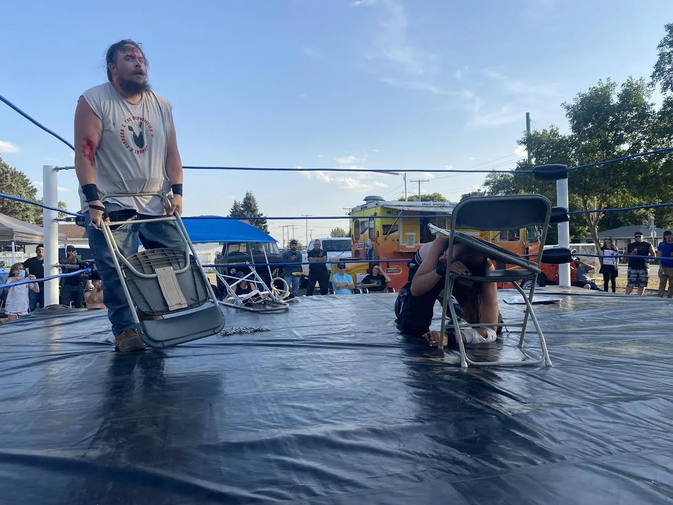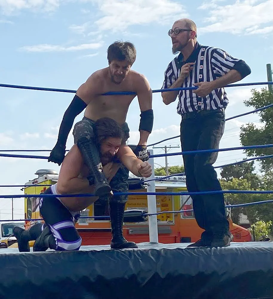 Those in attendance were treated to six wrestling matches, including a Tag Team Championship bout and an Anything Goes, Over-the-Top, Bunkhouse Battle Royal, where weapons were not only legal but highly encouraged, all in the motorbike packed parking lot of DNA Cycle & Service on 9th Ave SW.
