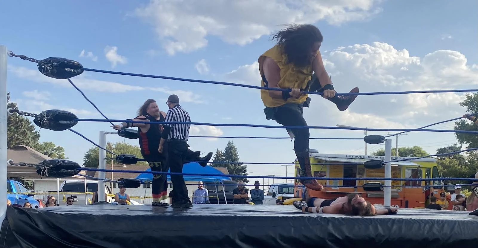 Screaming Eagle was Lot Brawl’s first participant brave enough to jump through the ropes, onto the hard ground to execute a flying assault. But taking the battle outside the ring, to the parking lot, turned out to be a bad strategy for the Eagle as Creed took the opportunity to pummel him up and down before tossing him back into the ring.