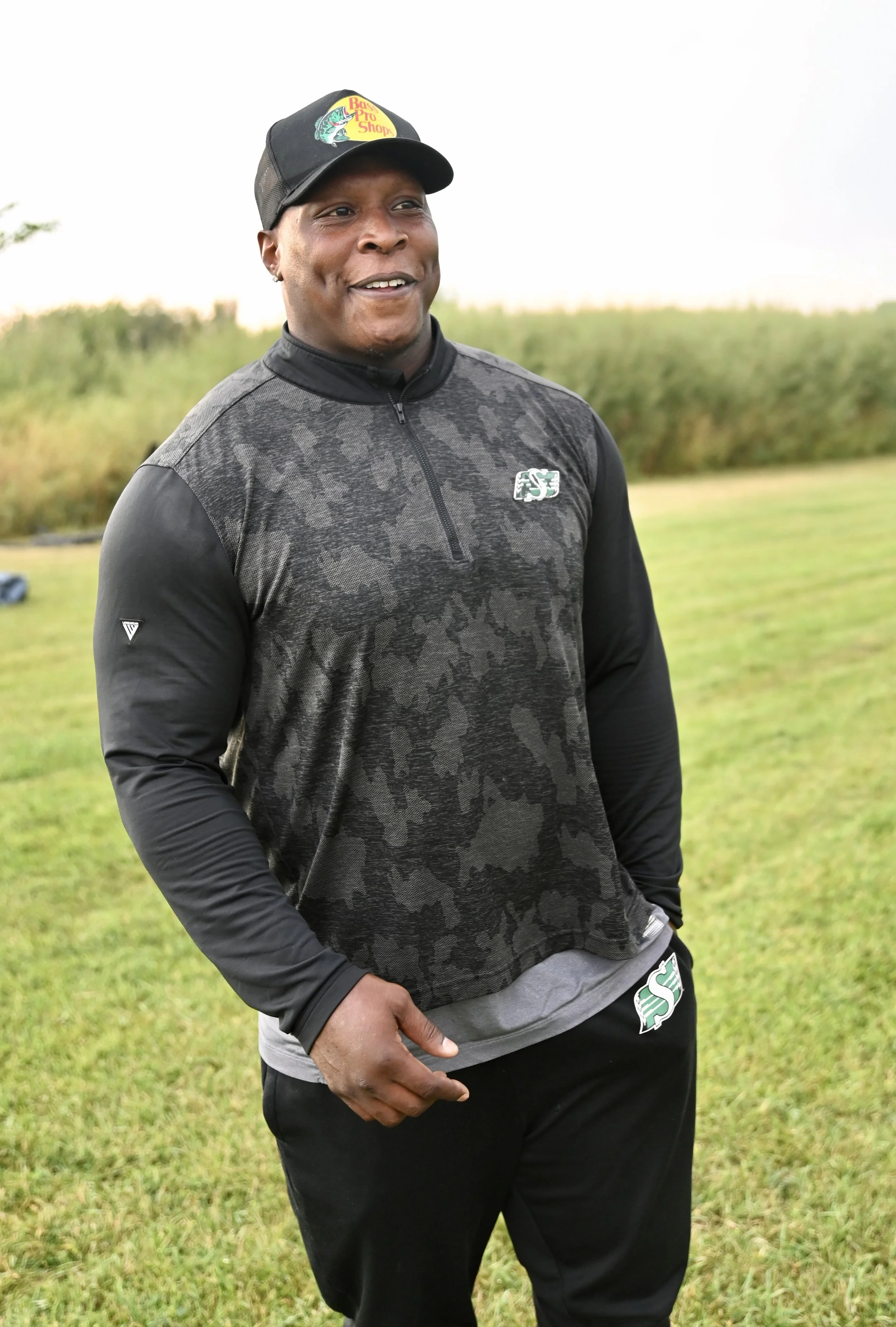 Micah Johnson, a defensive tackle with the Saskatchewan Roughriders and two time Grey Cup champion and three time CFL All-star, was on the sidelines helping out the Moose Jaw Mafia.
