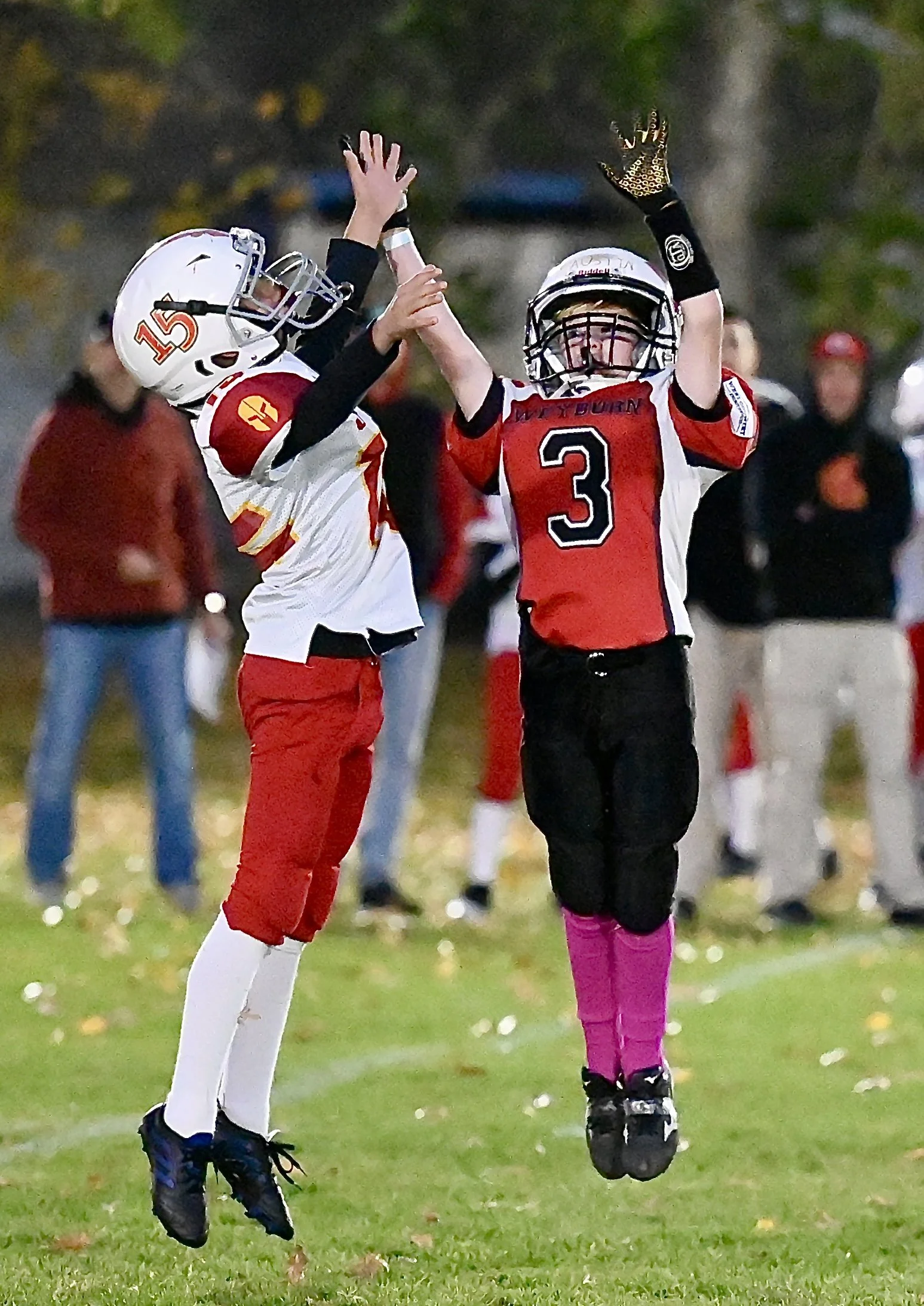 MJ Spartans Curtis Hender (left) jumps against the Ravens’ Austin Davies for a pass - MJ Independent photo
