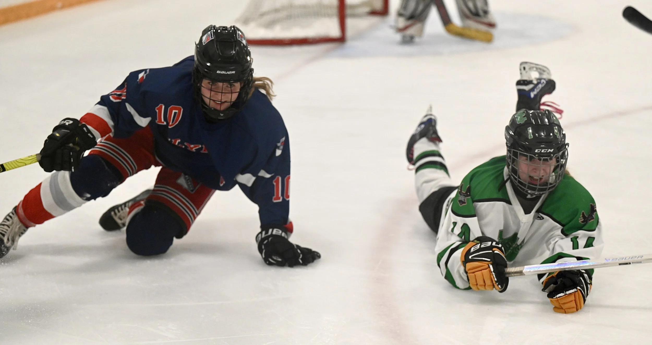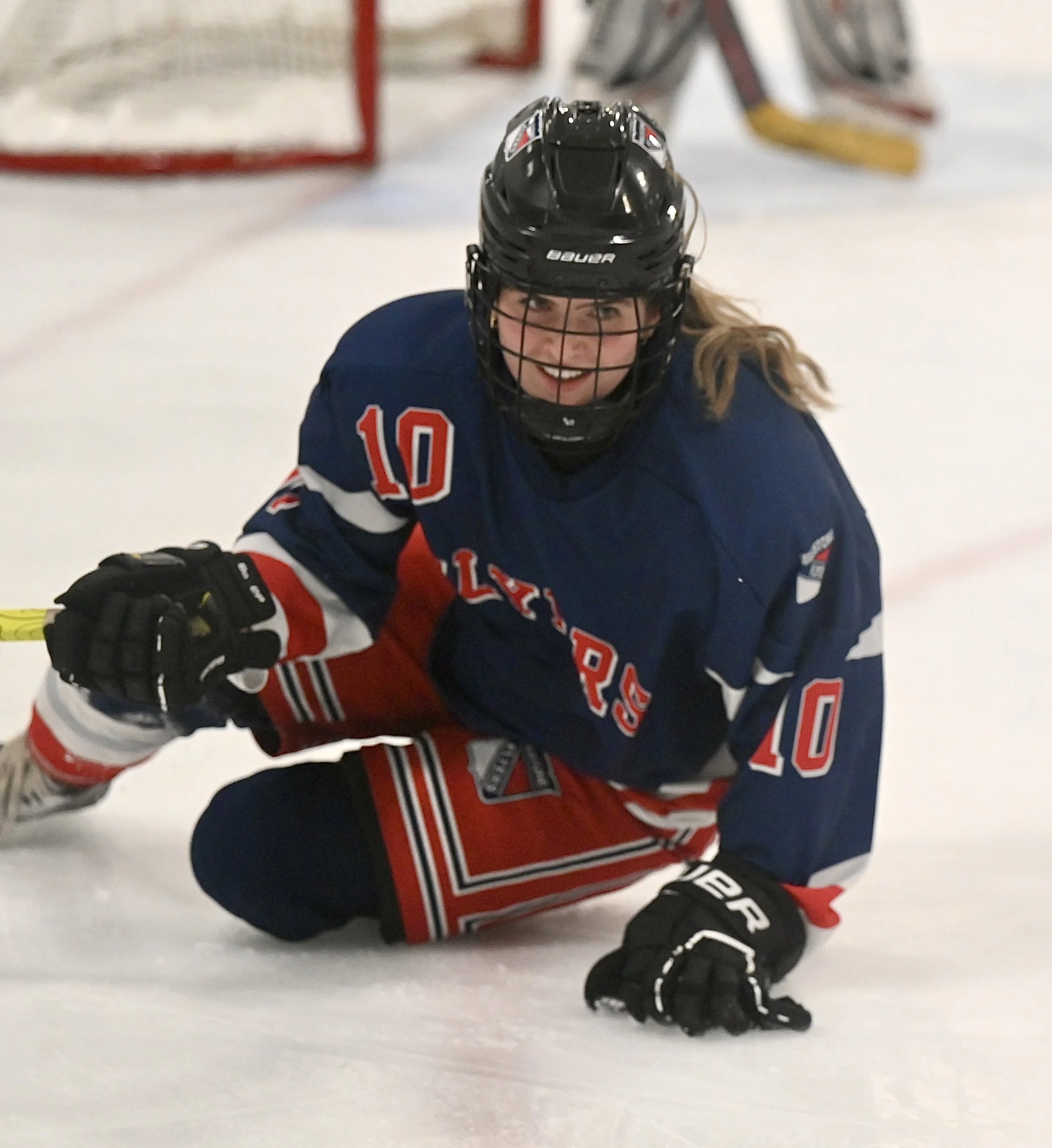 Milestone Flyers Bryn Montgomery smiles after she and Moose Jaw Mavericks Miley Kleckner slid along the ice - MJ Independent photo