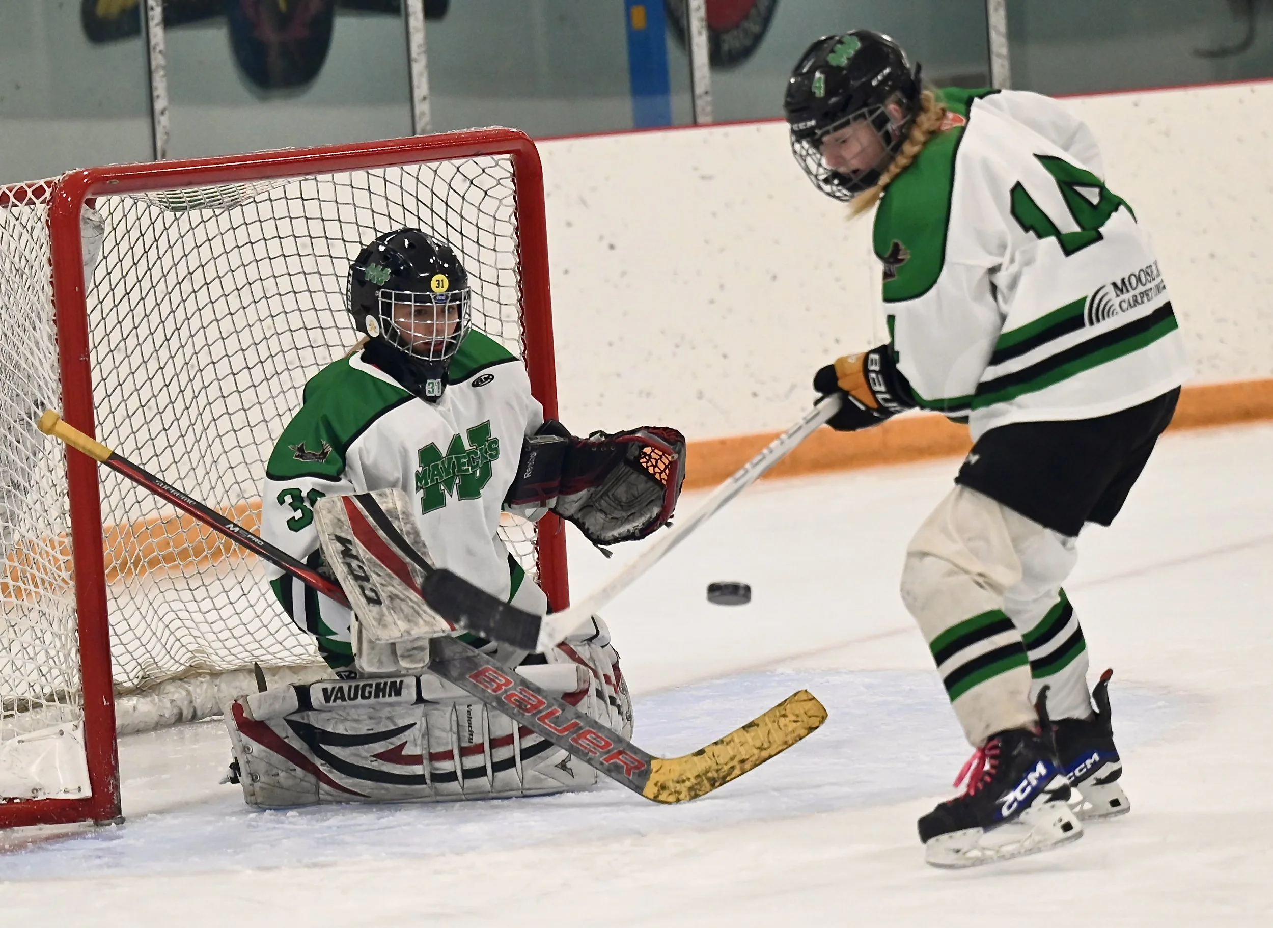 Moose Jaw Mavericks Miley Kleckner protects against any rebounds in front of goalie Sara Umana - MJ Independent photo