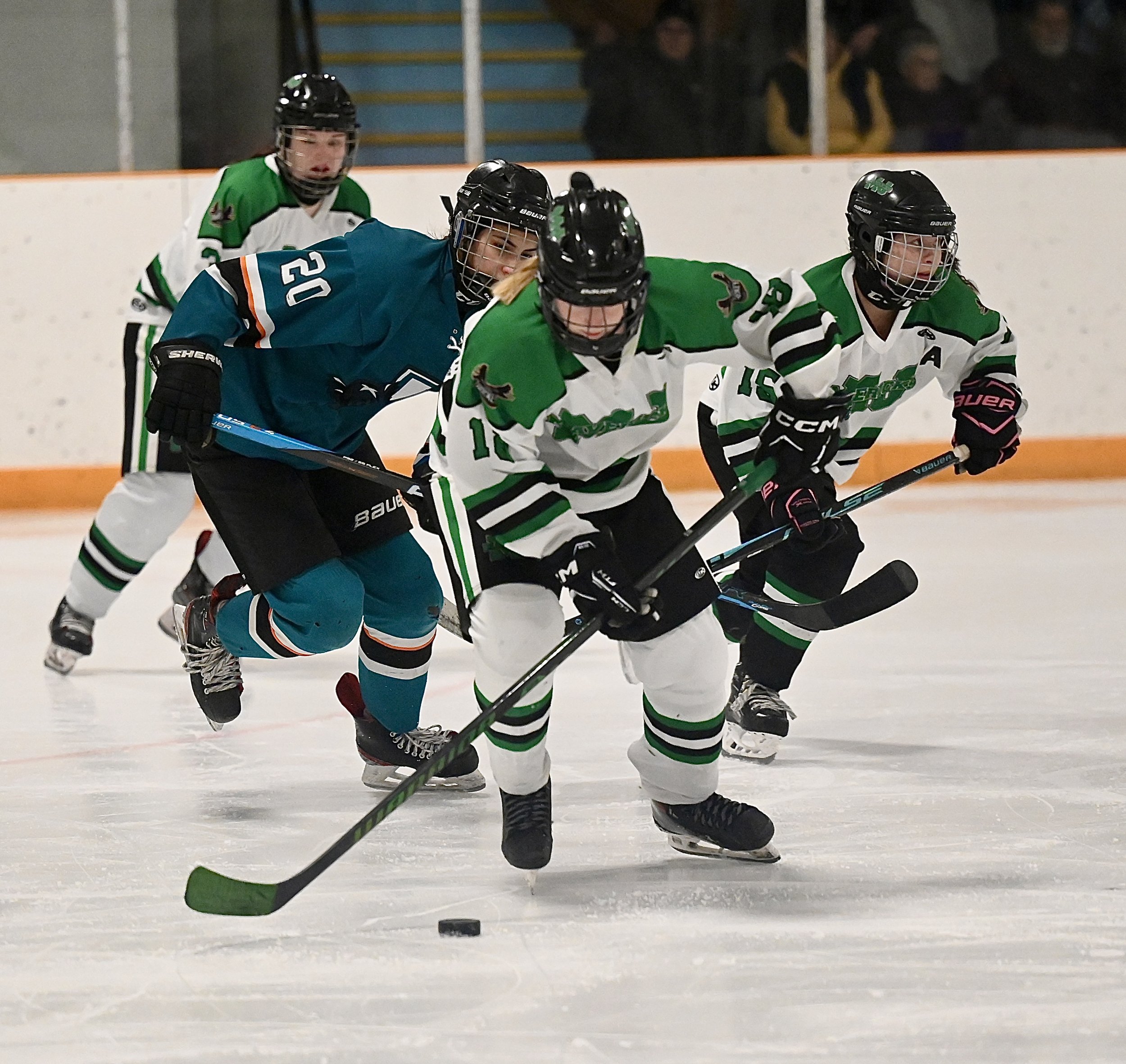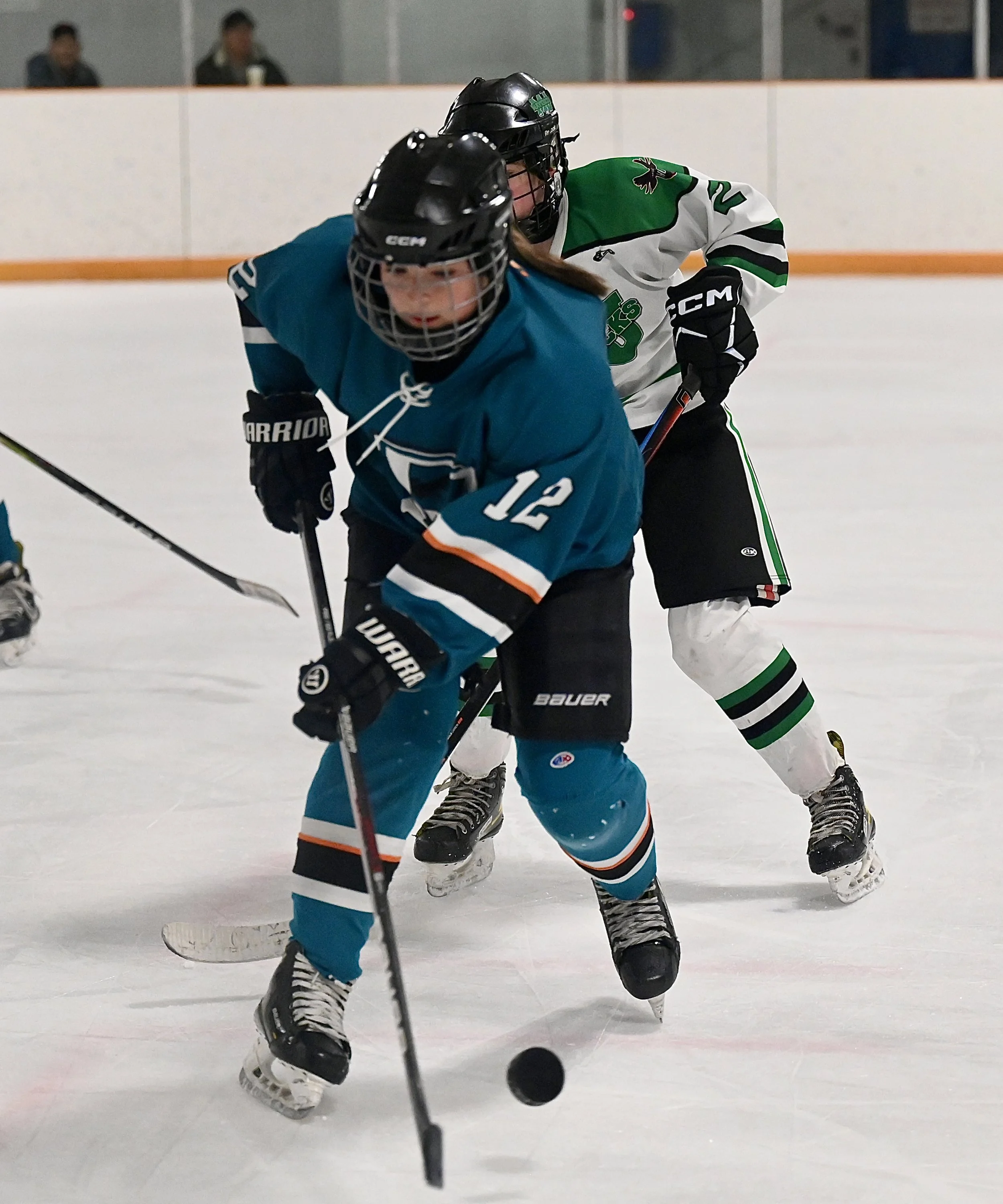 Mavericks Ava Nichol makes a slight stumble attempting to clear the puck in front of goaltender Charlotte McKee - MJ Independent photo