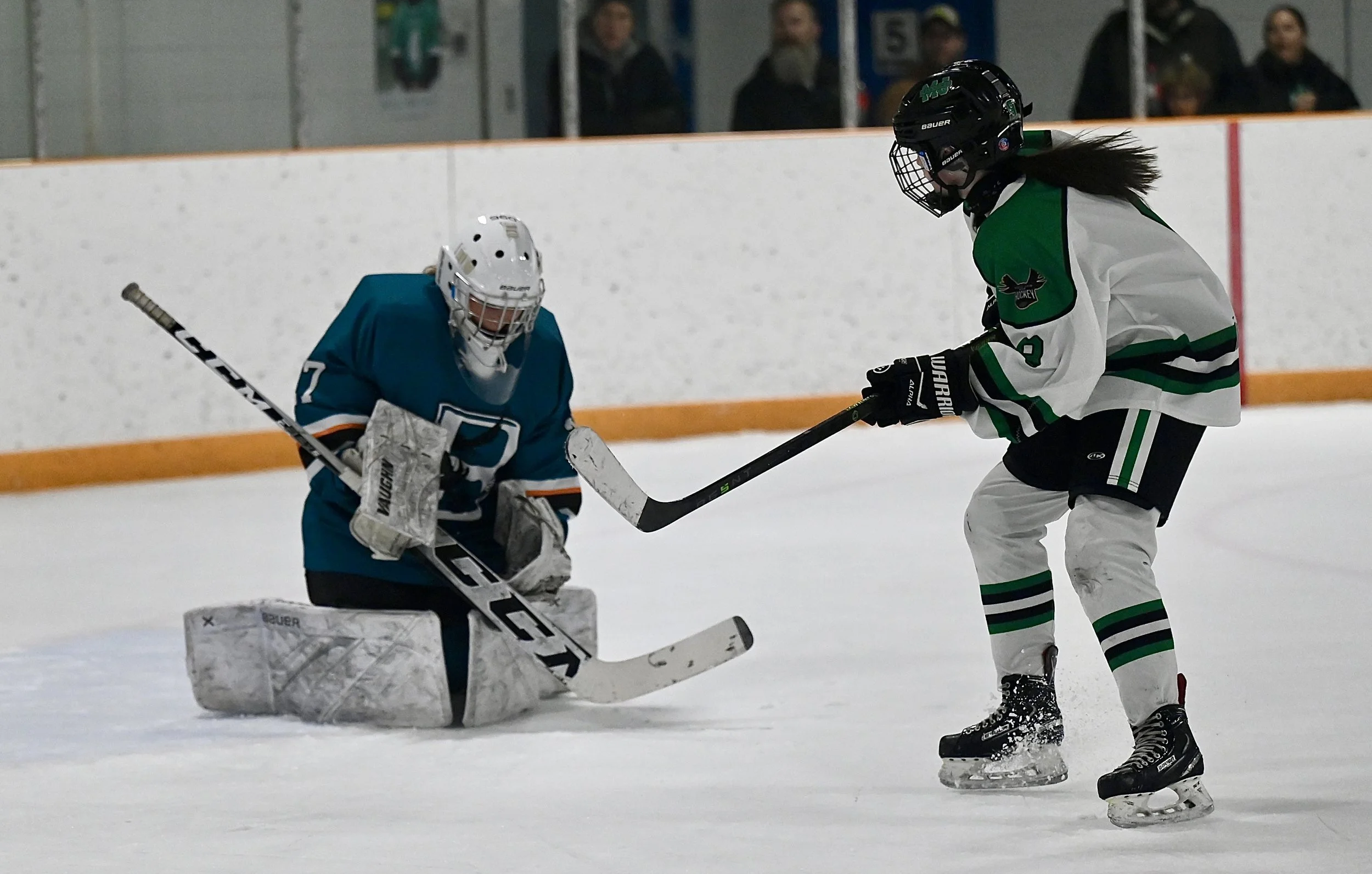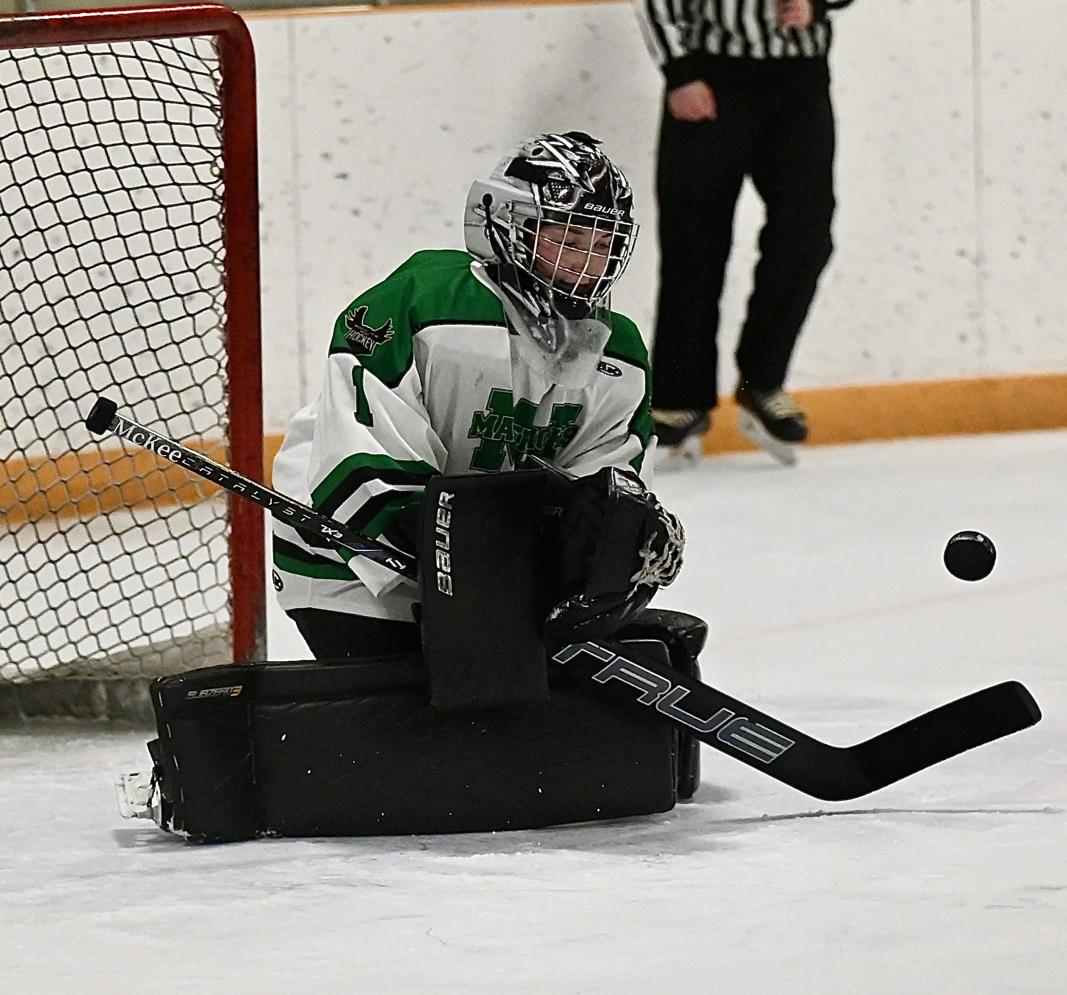 Mavericks goaltender Charlotte McKee makes a key save - MJ Independent photo