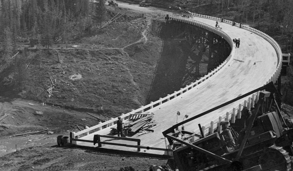 This is the Kiskatinaw Bridge under construction in 1942-43, south of Fort St. John. The wooden deck was terrifying when wet.
