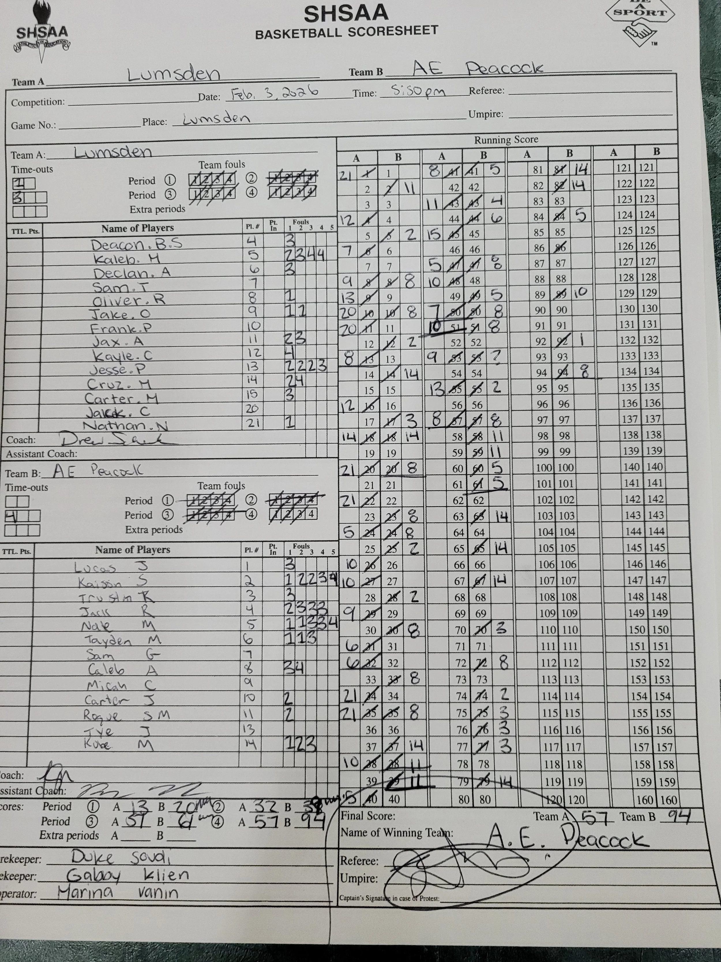 The Peacock Toilers senior boys basketball team defeated the Lumsden Devils 94 - 57 on Tuesday evening.