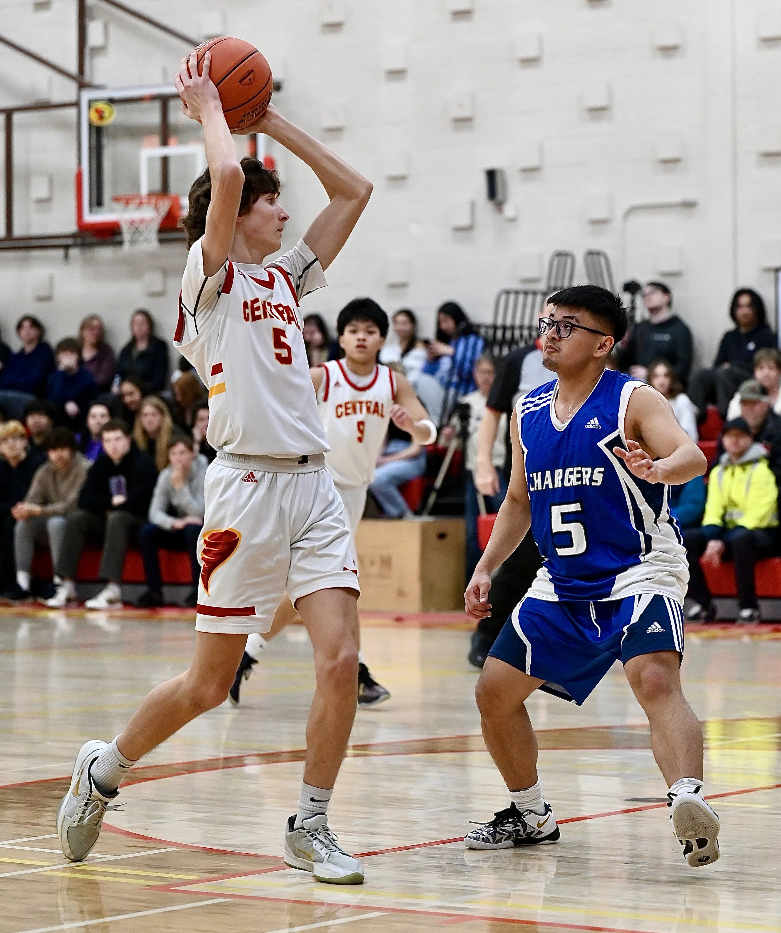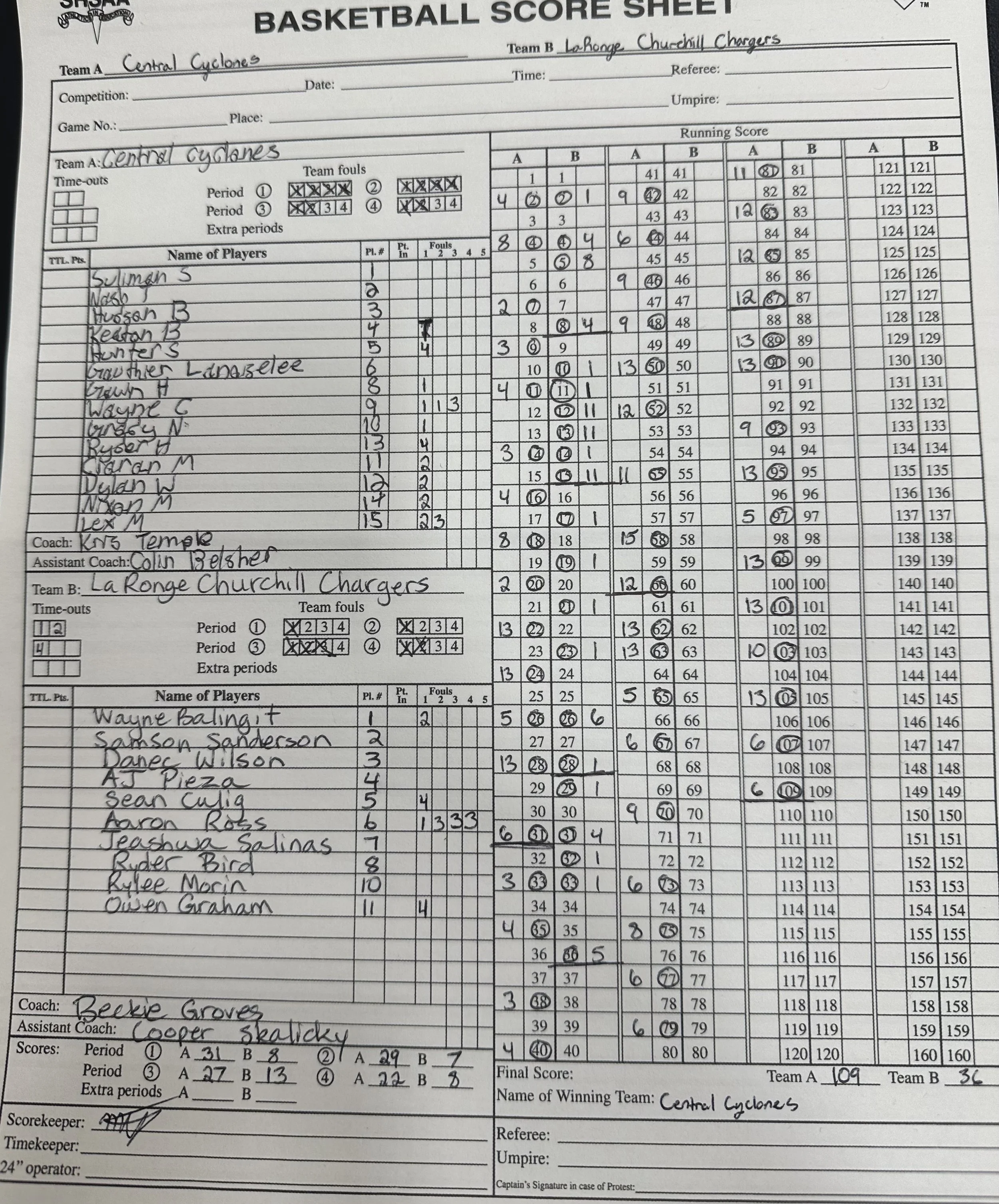 To the roaring applause of a student filled gym the first seeded Central Cyclones easily defeated the sixteenth seeded La Ronge Chargers in their first game of regional playdowns 109 - 36.