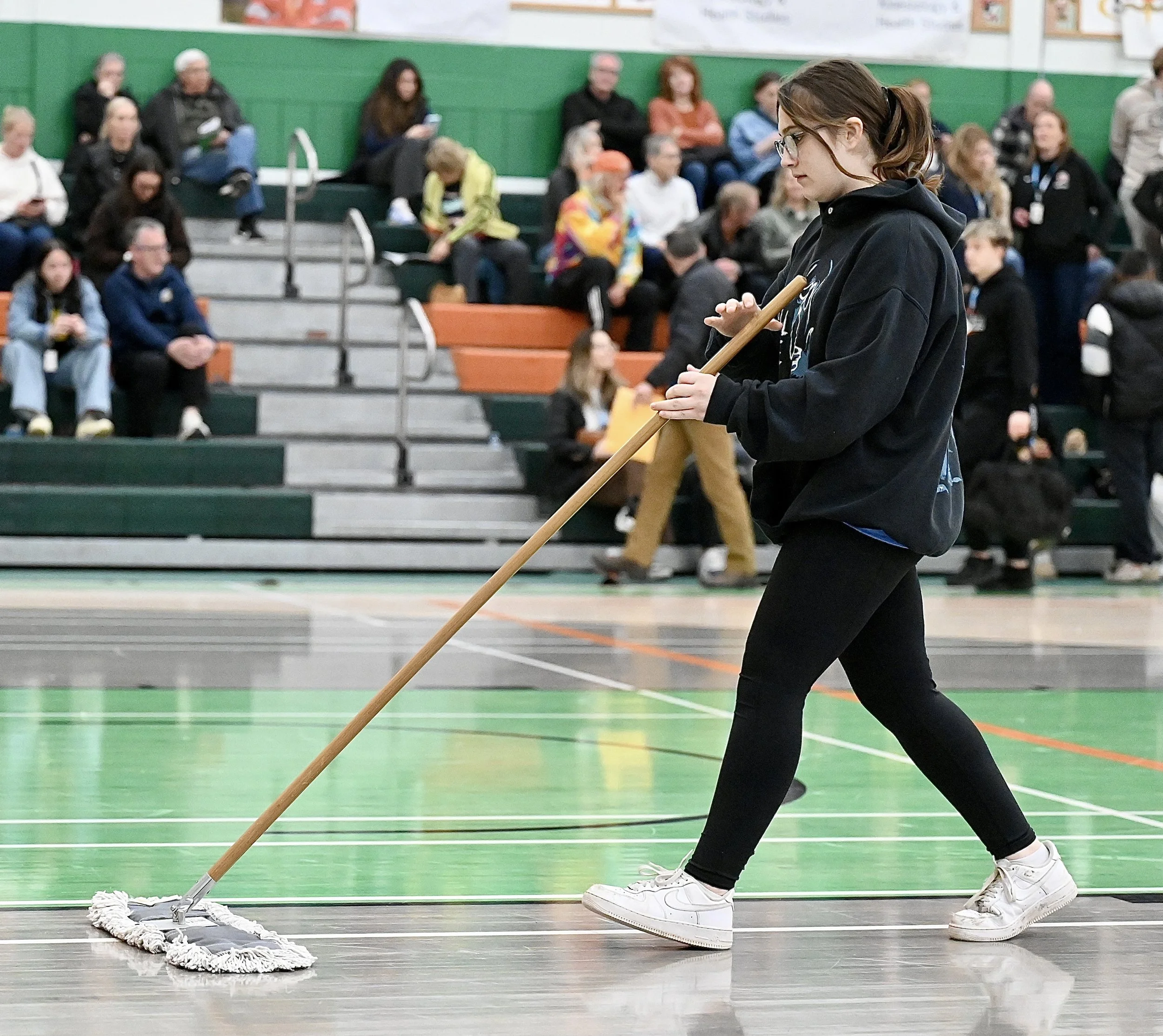A volunteer - one of the hundreds - cleans the court during a timeout. Volunteers giving their time is key to the event’s success - MJ Independent photo
