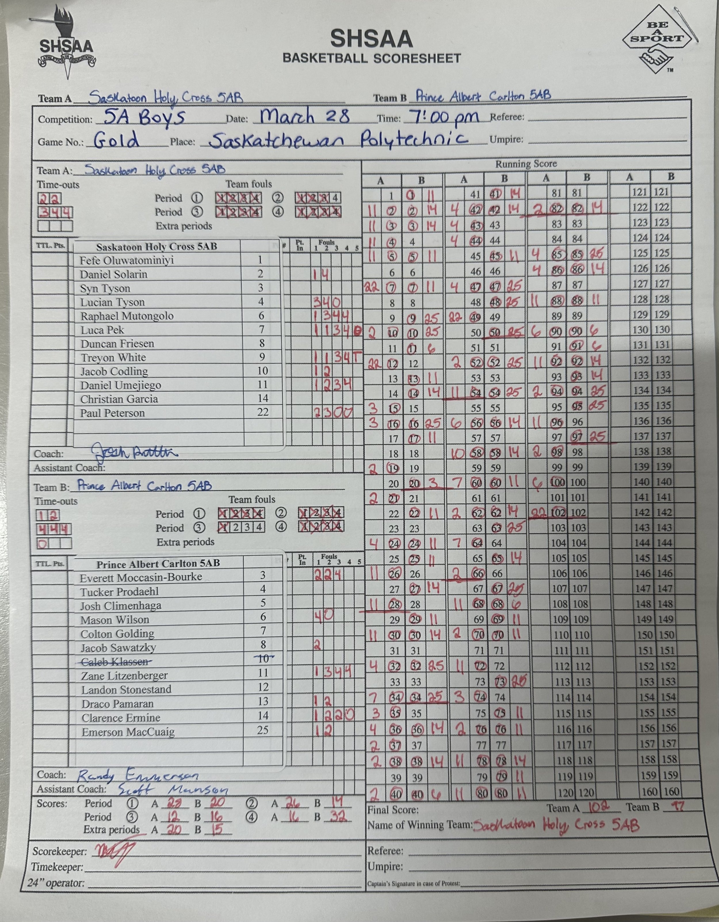 Saskatoon’s Holy Cross defeats Prince Albert Carlton 102 - 97 in an overtime thriller