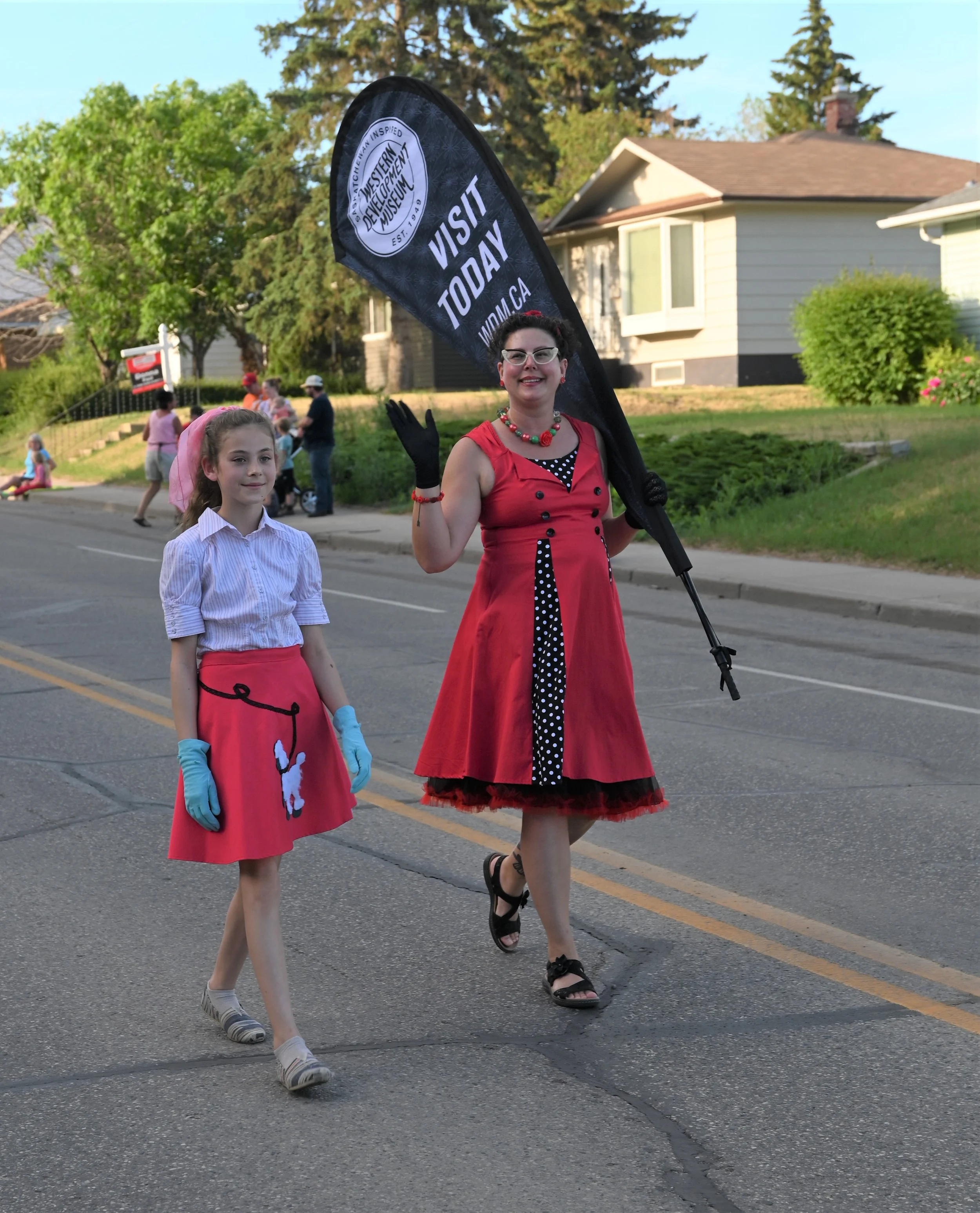 Karla Rasmussen (right) , from the Western Development Museum, along with a friend walked the parade route in 1950’s classic garb