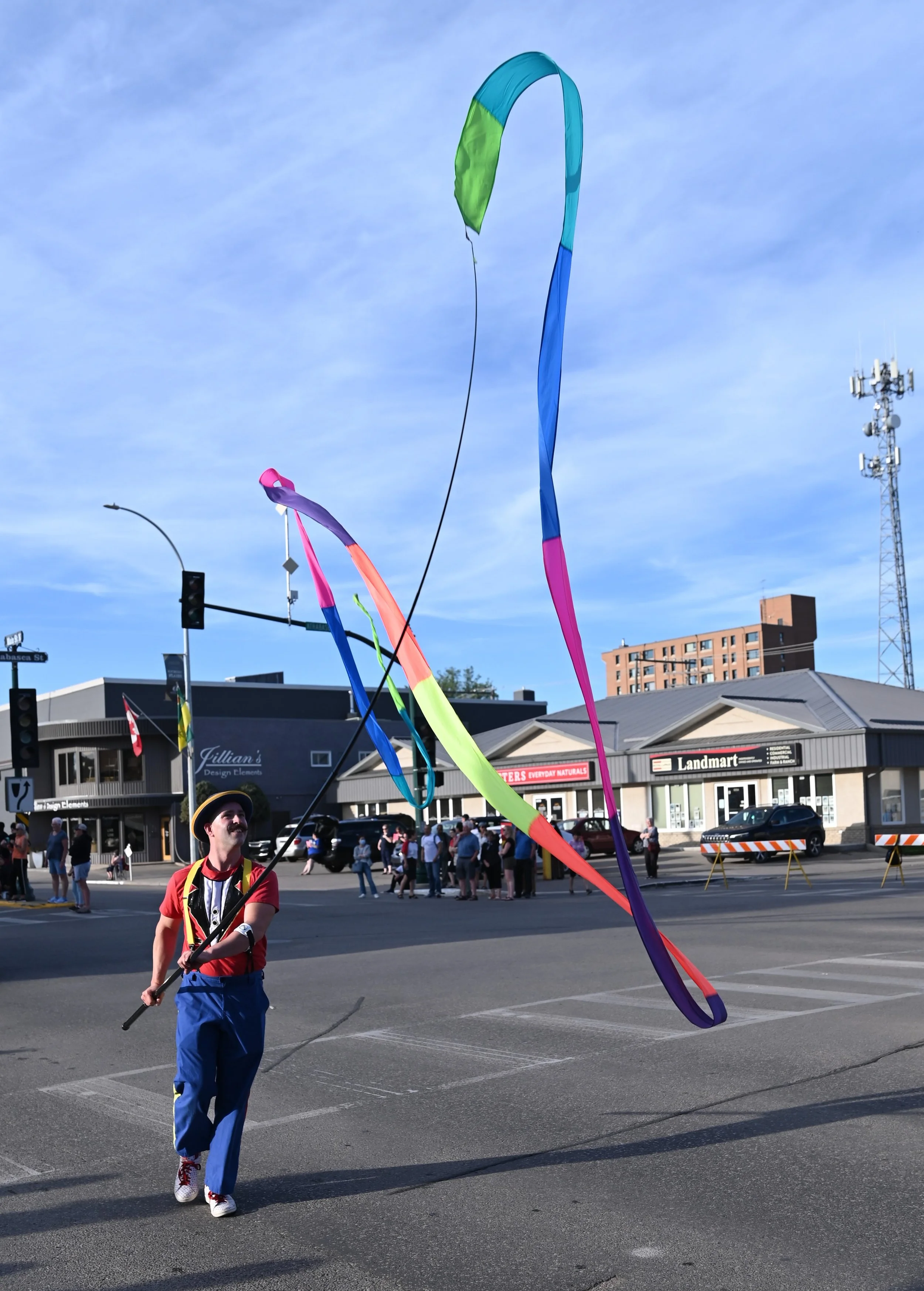 Mr Circus, who will be performing throughout the Moose Jaw Hometown Fair, thrilled the crowd with his colourful ribbon twirling skills