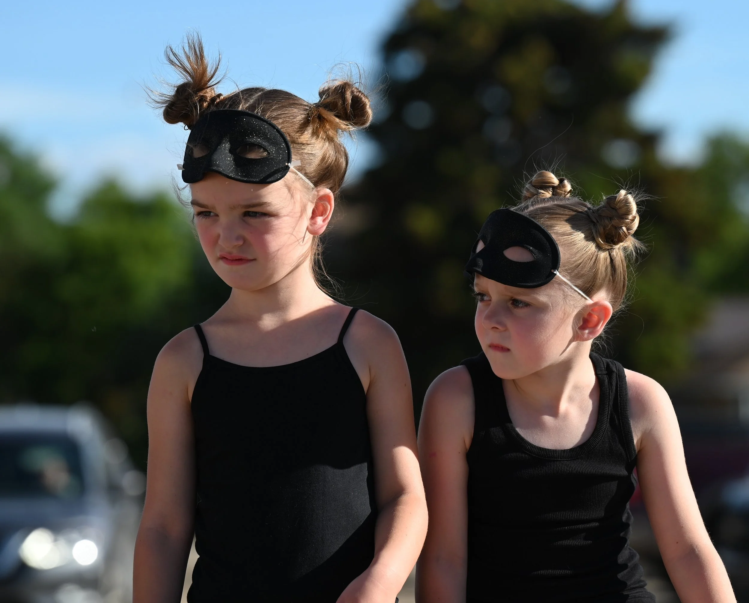 Two young parade participants wait in the parade marshalling area on the Doris Sitter float