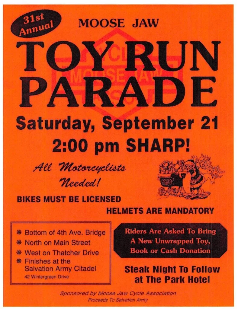 Starting at 2 pm sharp the Moose Jaw Cycle Association’s 31st annual Moose Jaw Toy Run Parade takes place.