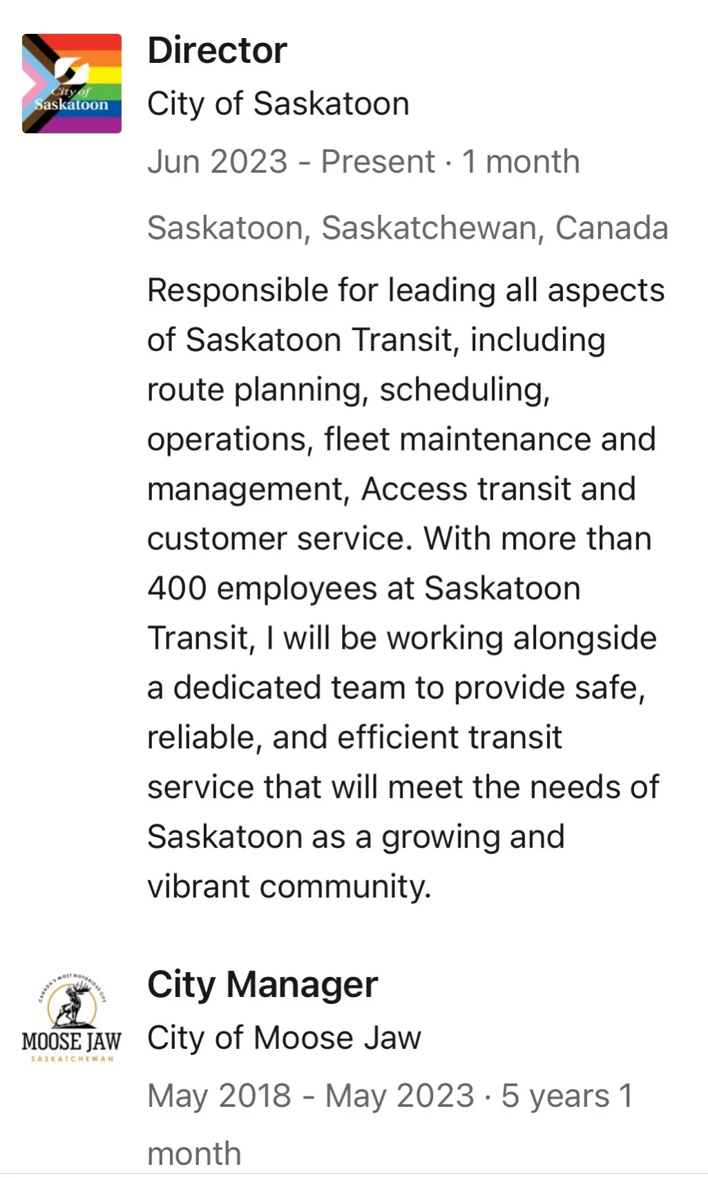 According to his LinkedIn profile he started his new job with the City of Saskatoon sometime this month.