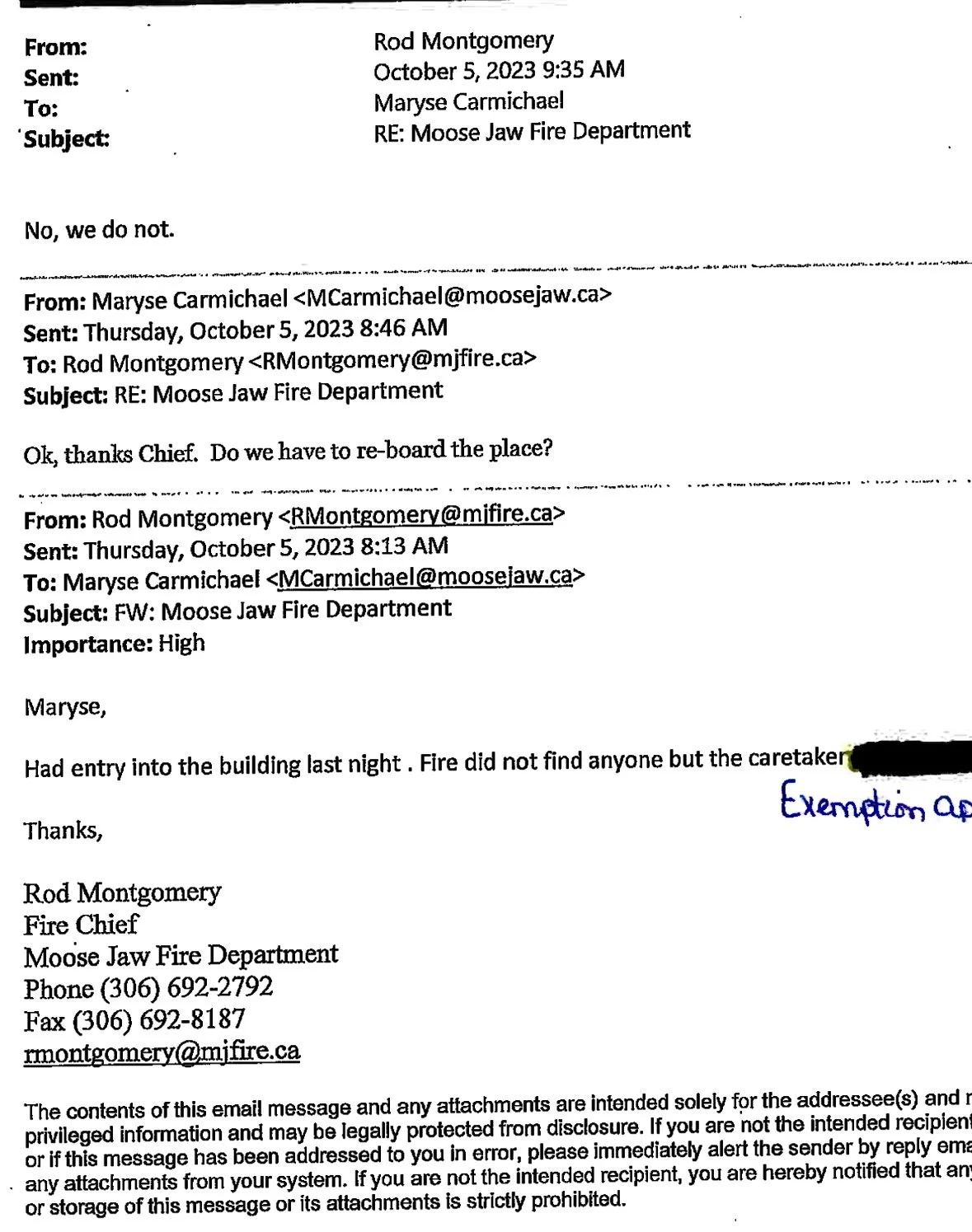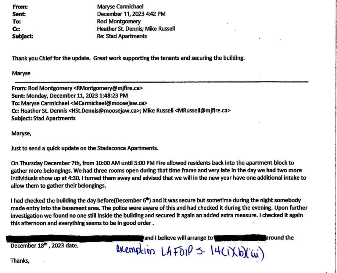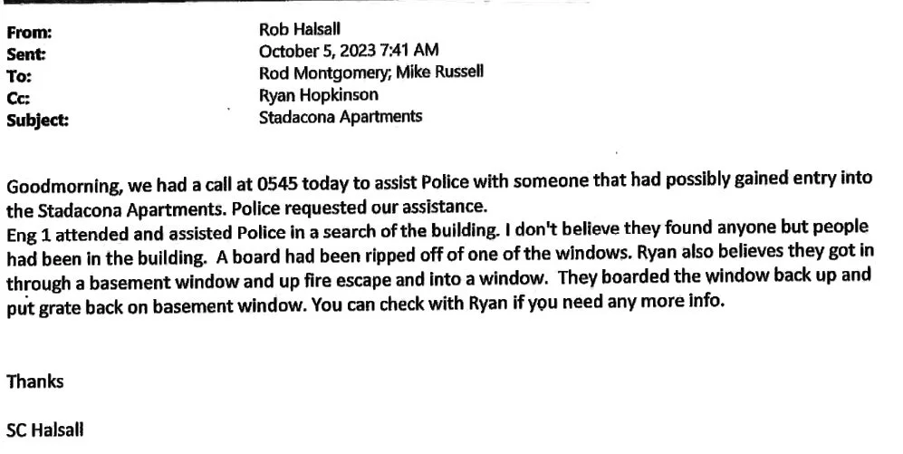 In an October 5, 2023 email from MJFD Chief Rod Montgomery to city manager Maryse Carmichael he advises her about the break-in but states the Stadacona Apartments don’t need to be reboarded up. See email below.