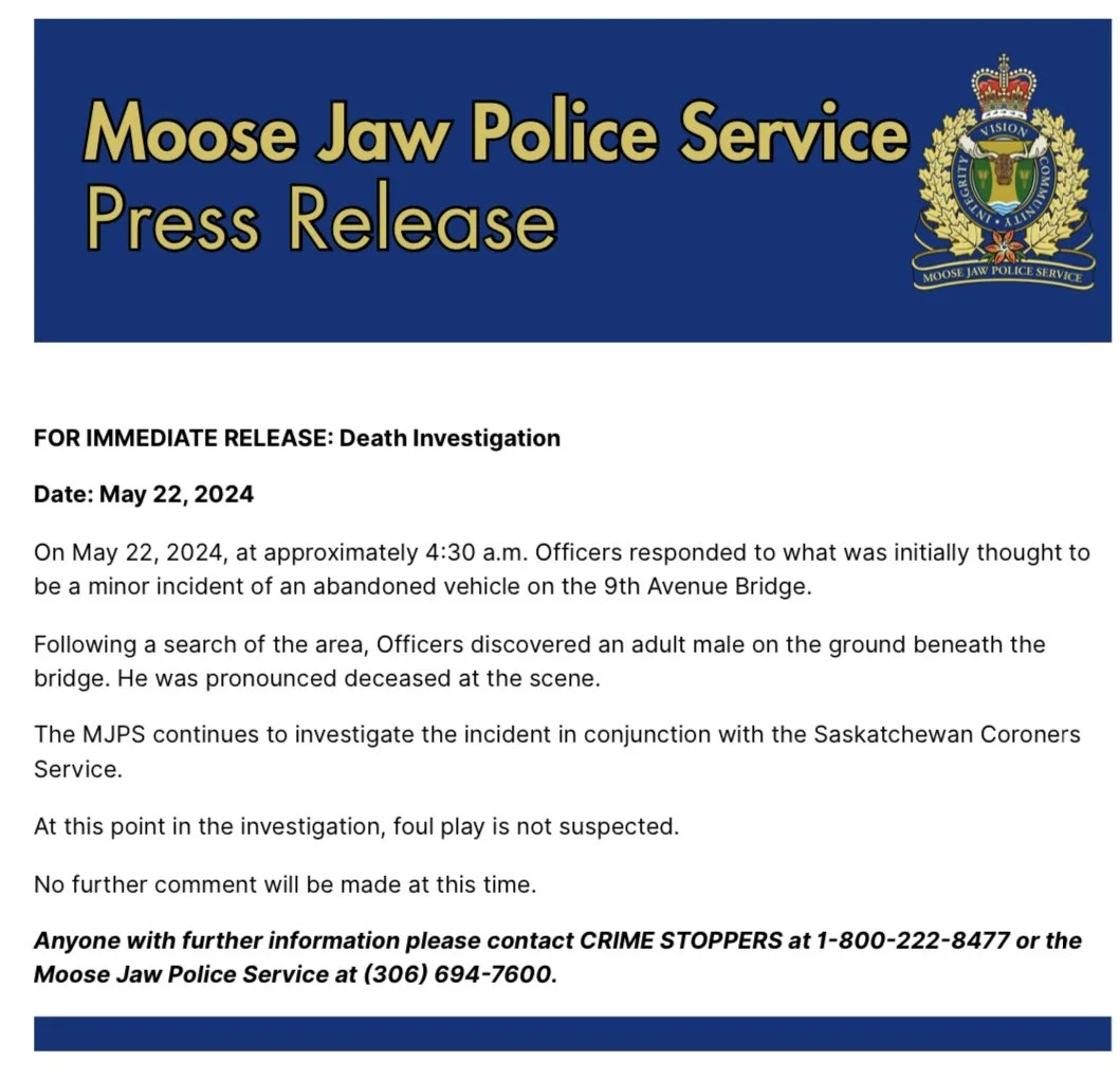 The MJPS continues to investigate the incident in conjunction with the Saskatchewan Coroners Service.
