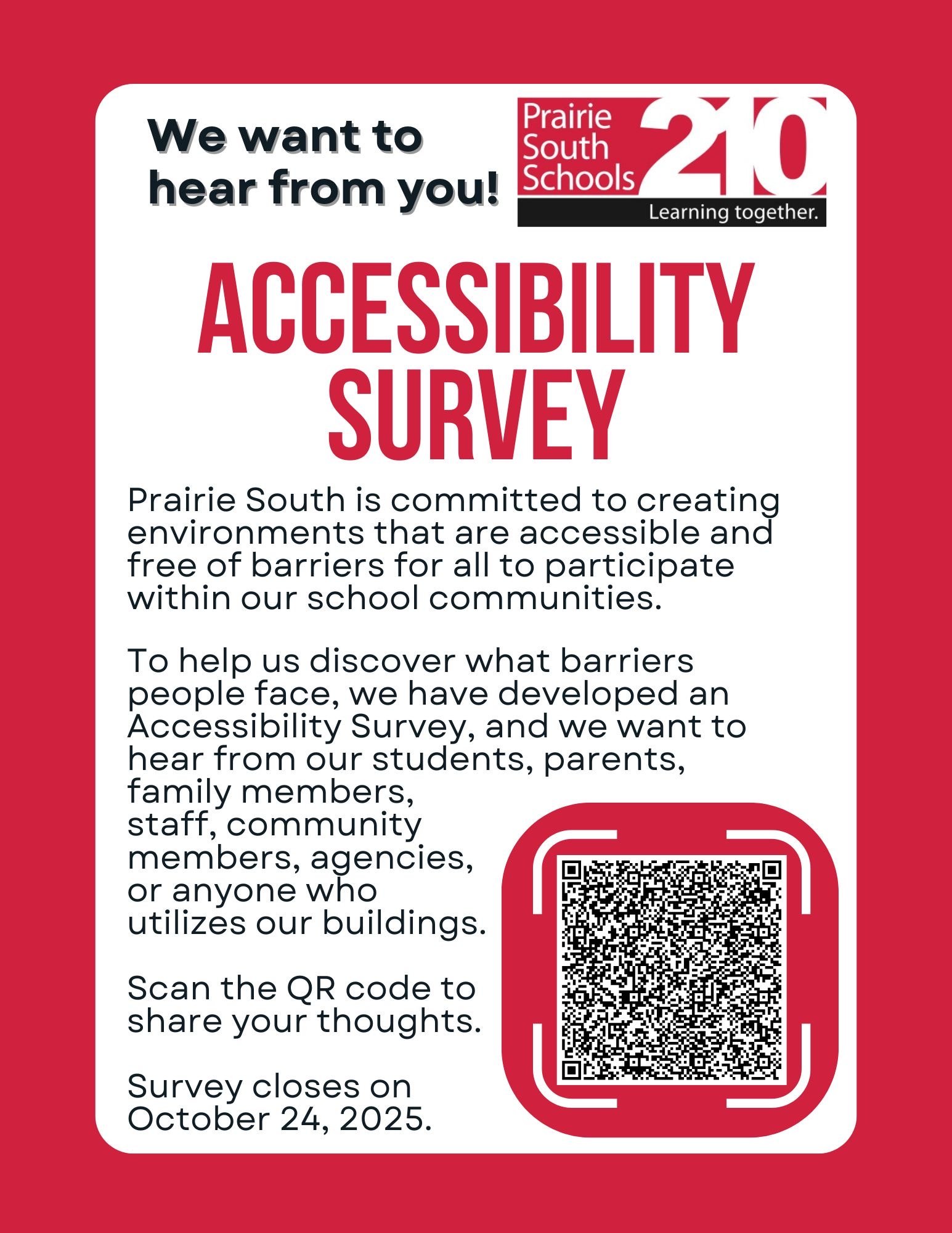 The survey can be found on our website at this link: Accessibility Survey – Prairie South School Division #210.