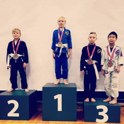 Roque Spaan-Murray on the podium after winning Gold in the Boys Featherweight Division. Phoenix Kivol (in black to the Roque’s right, won bronze.)