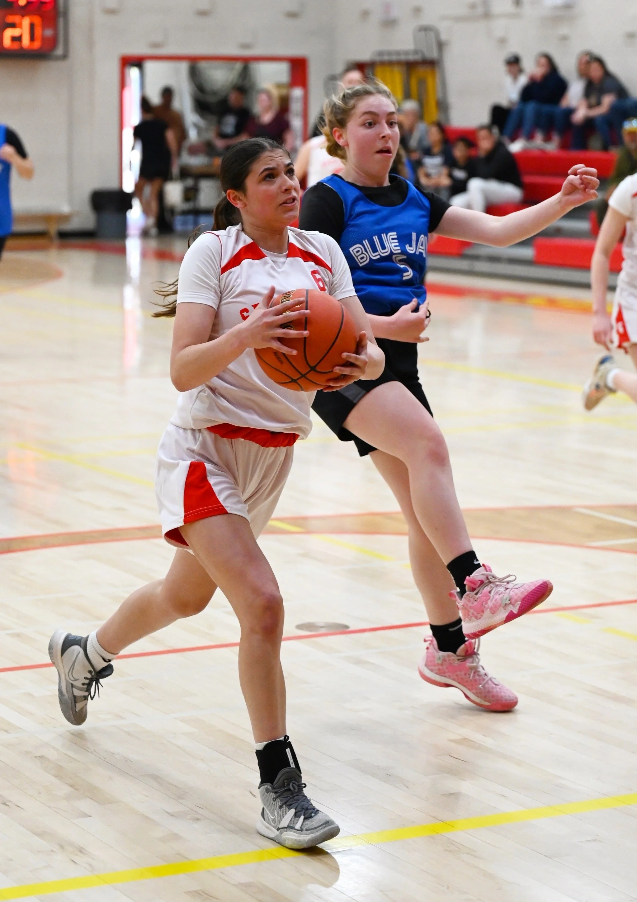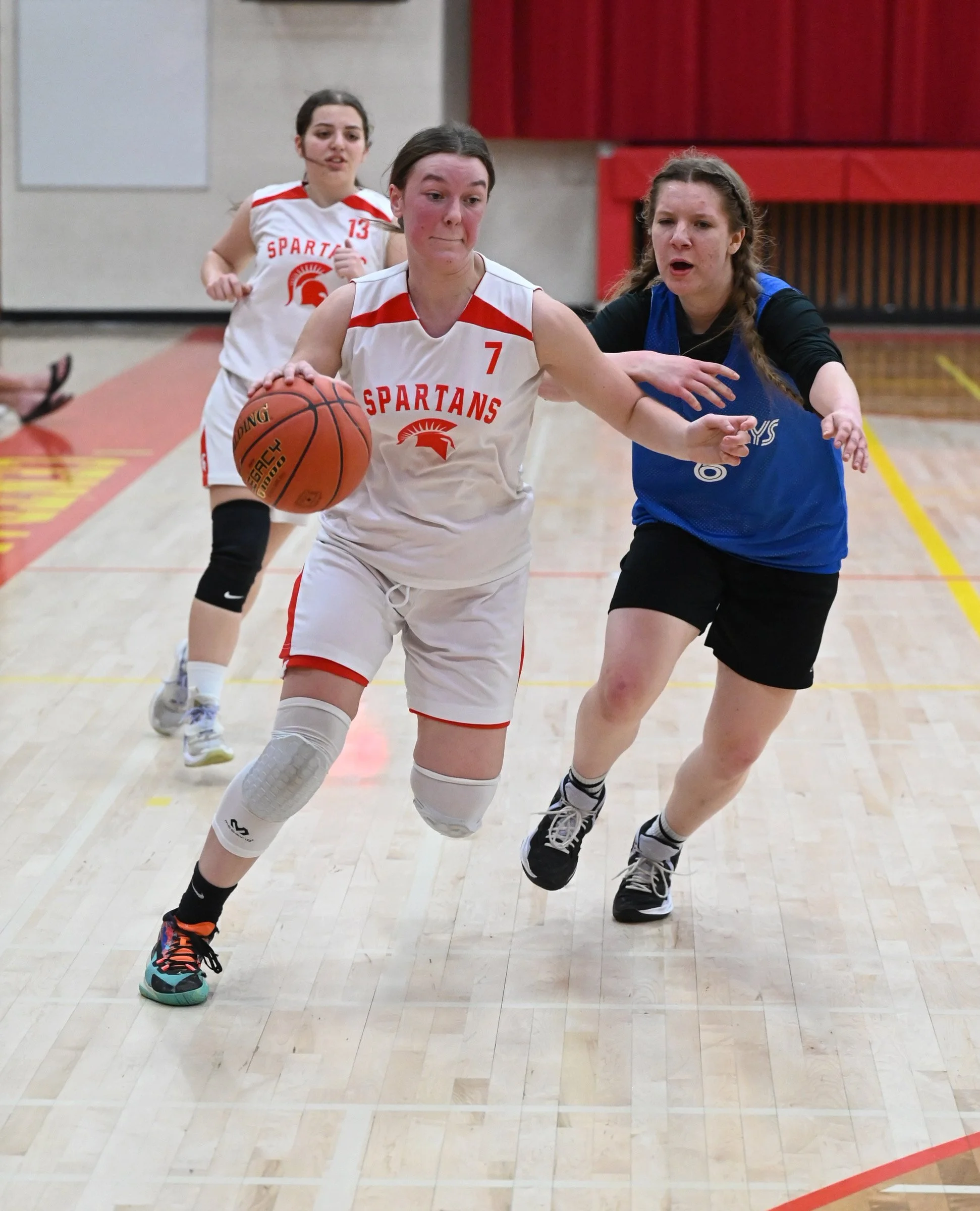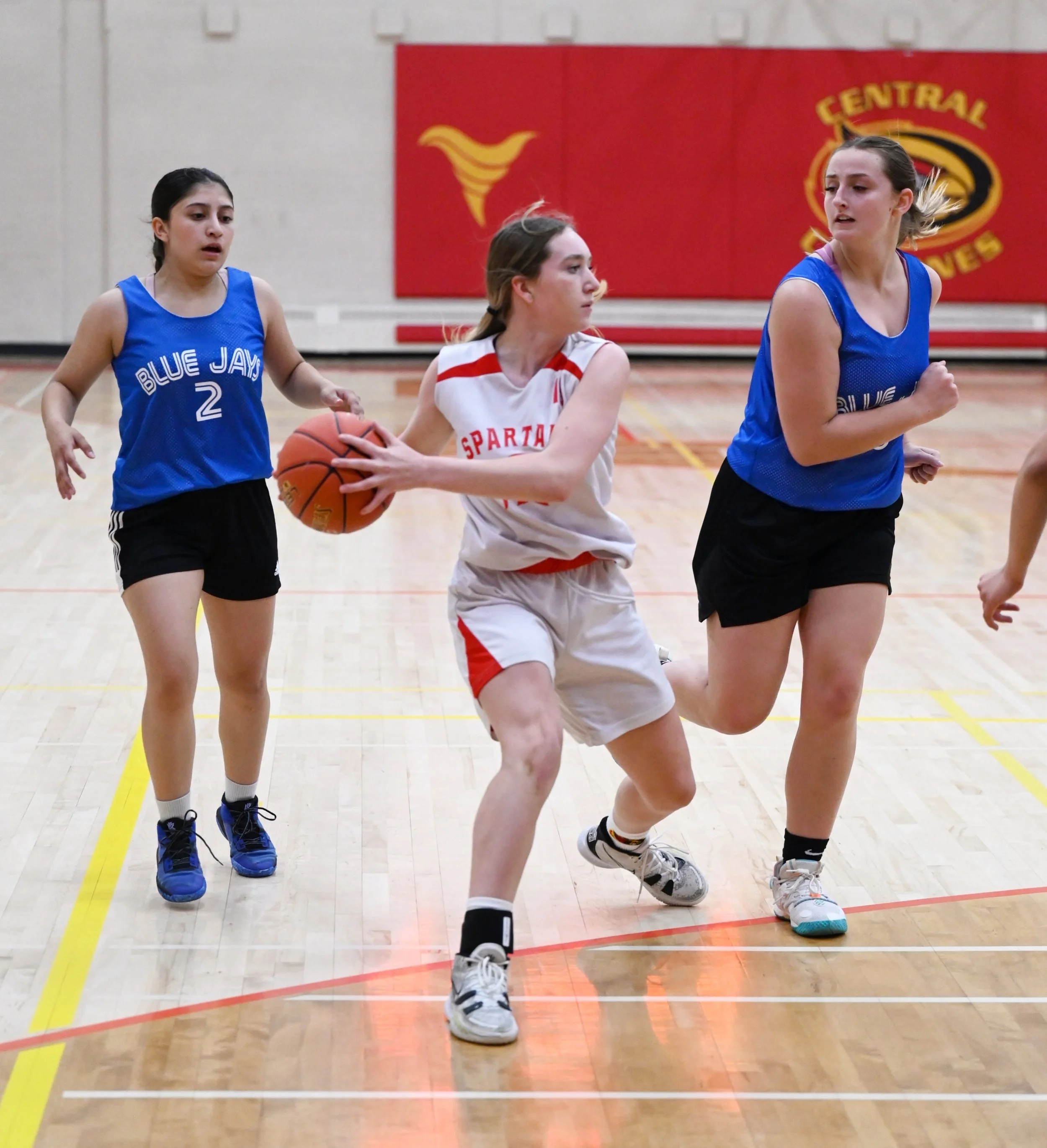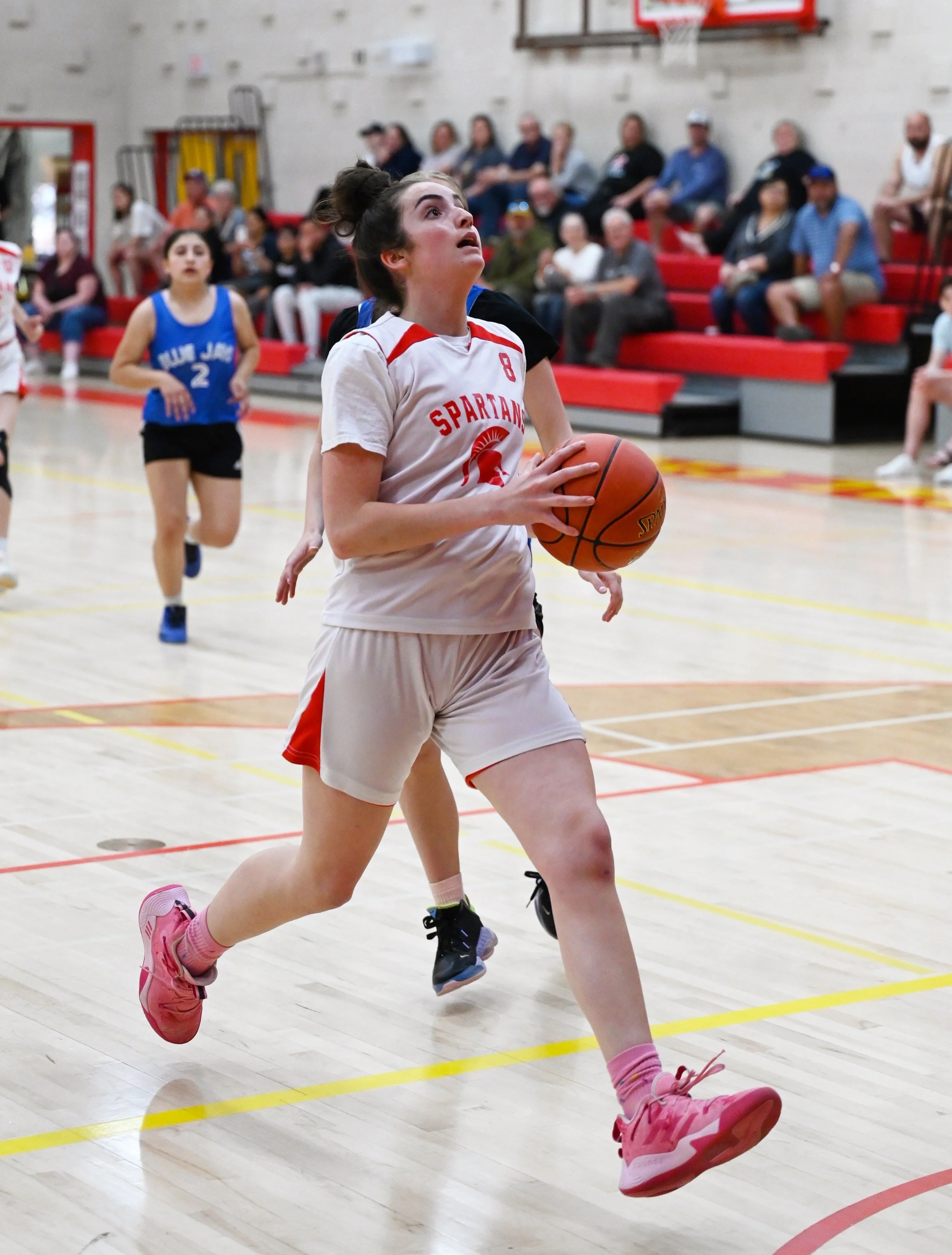 Breaking For The Basket - a member of the Spartans breaks in past a Blue Jays defender to score a basket in first quarter action.