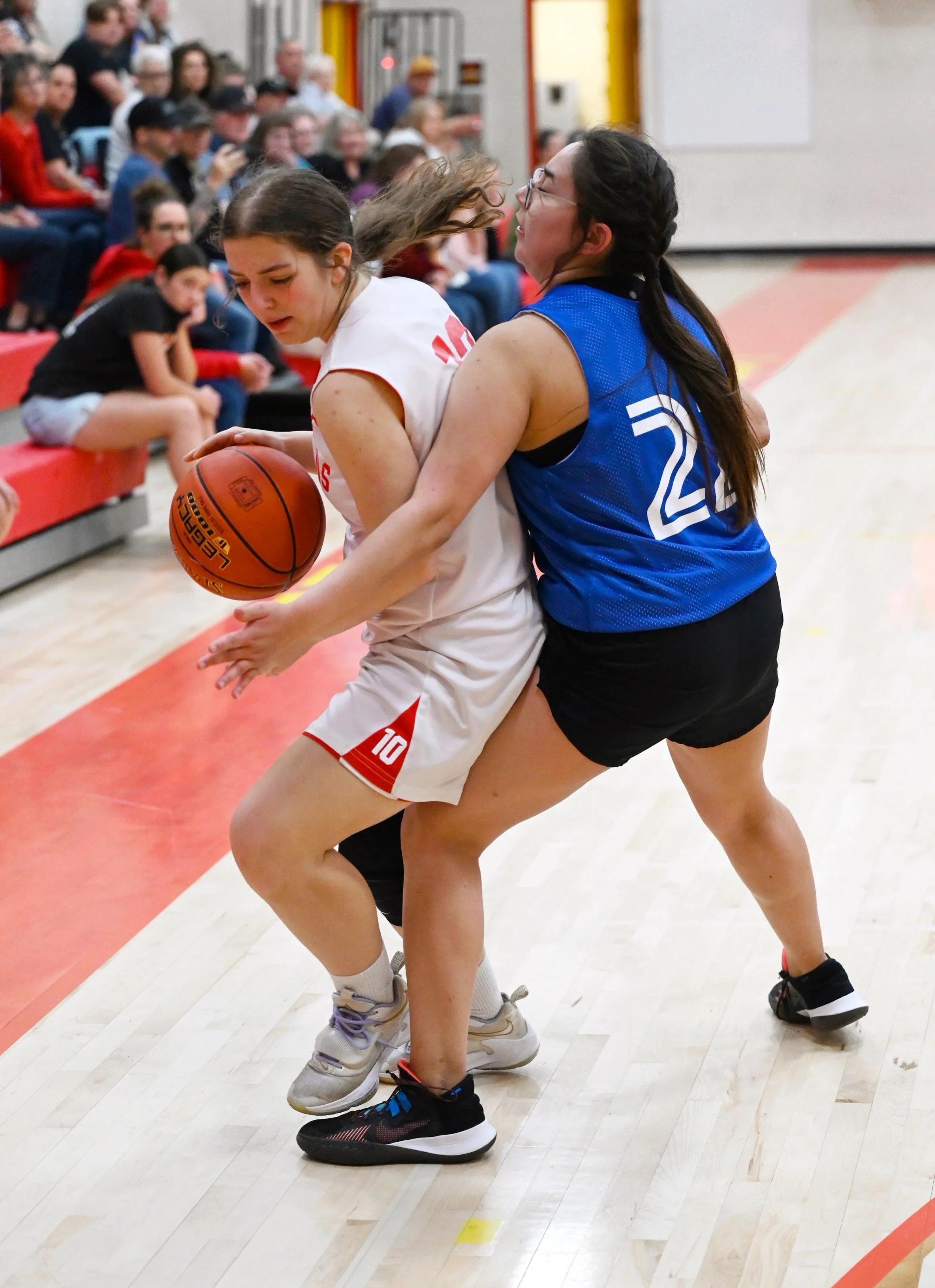 Blocking An Opponent Out - A Spartans player (right) protects against a Blue Jays player by leaning into her.
