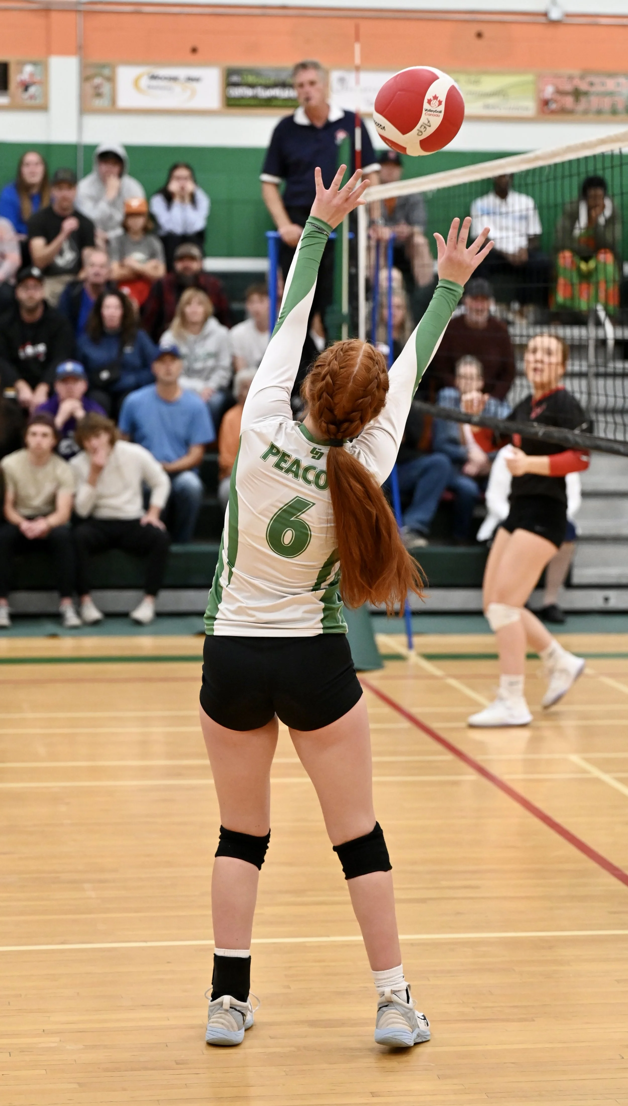 Peacock Toilers Jillian Polupski sets the ball in Tuesday evenings matchup against the Vanier Spirits - MJ Independent file photo