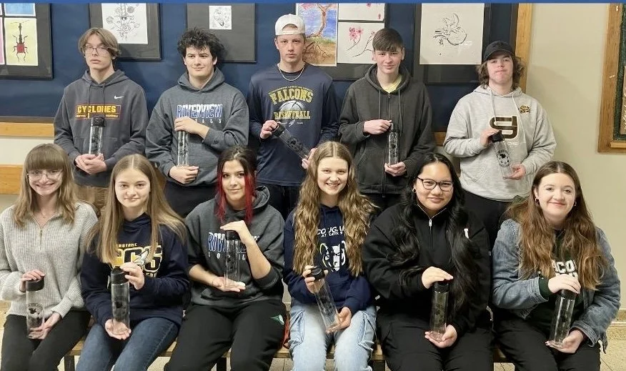 Front Row: Kaylee Hogeboom (Curling-AEP), Shyanne Greenwood-Gadd (Volleyball/Curling-CCS), Hannah Hipfner (Curling-RVCI), Keyana Thiessen (Basketball-BCA), Chloe Calubia (Curling-VCI), Jorja McCubbing (Curling-AEP)