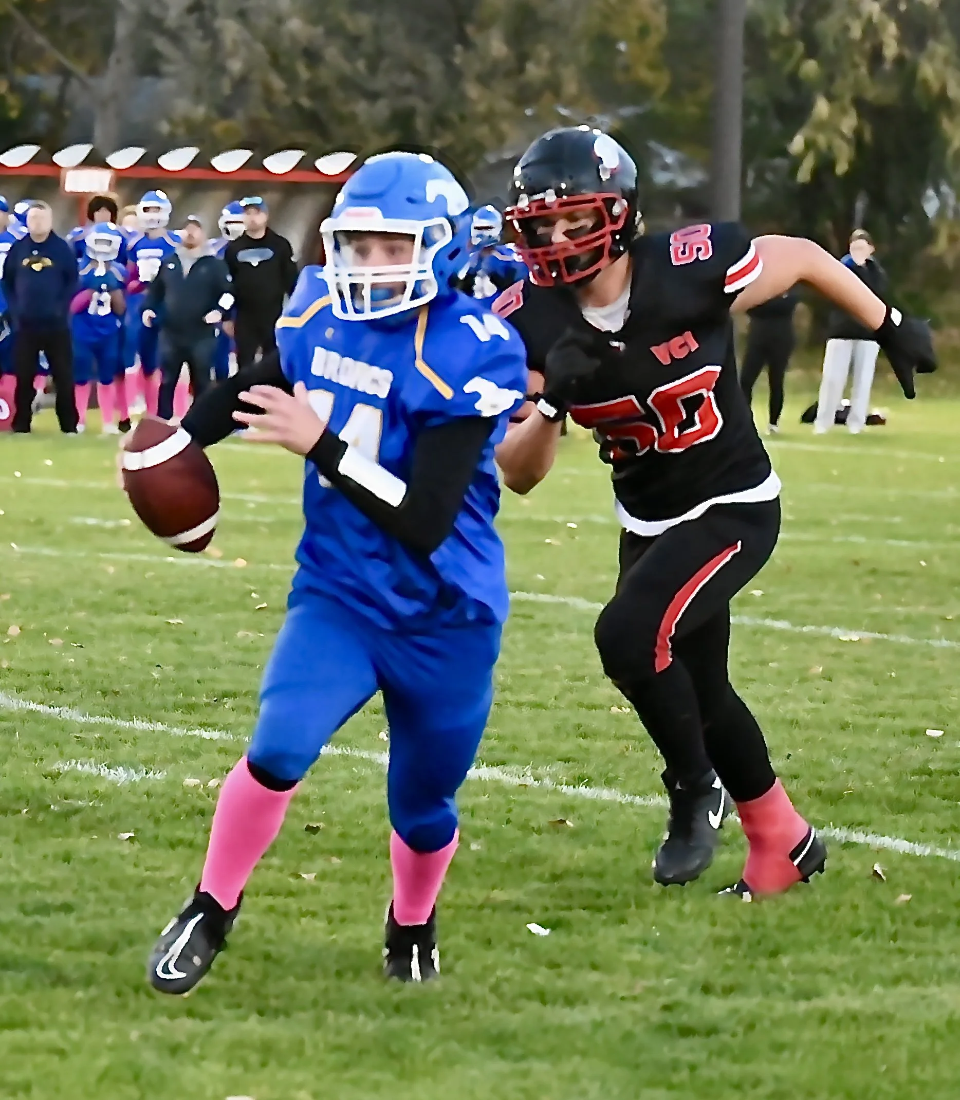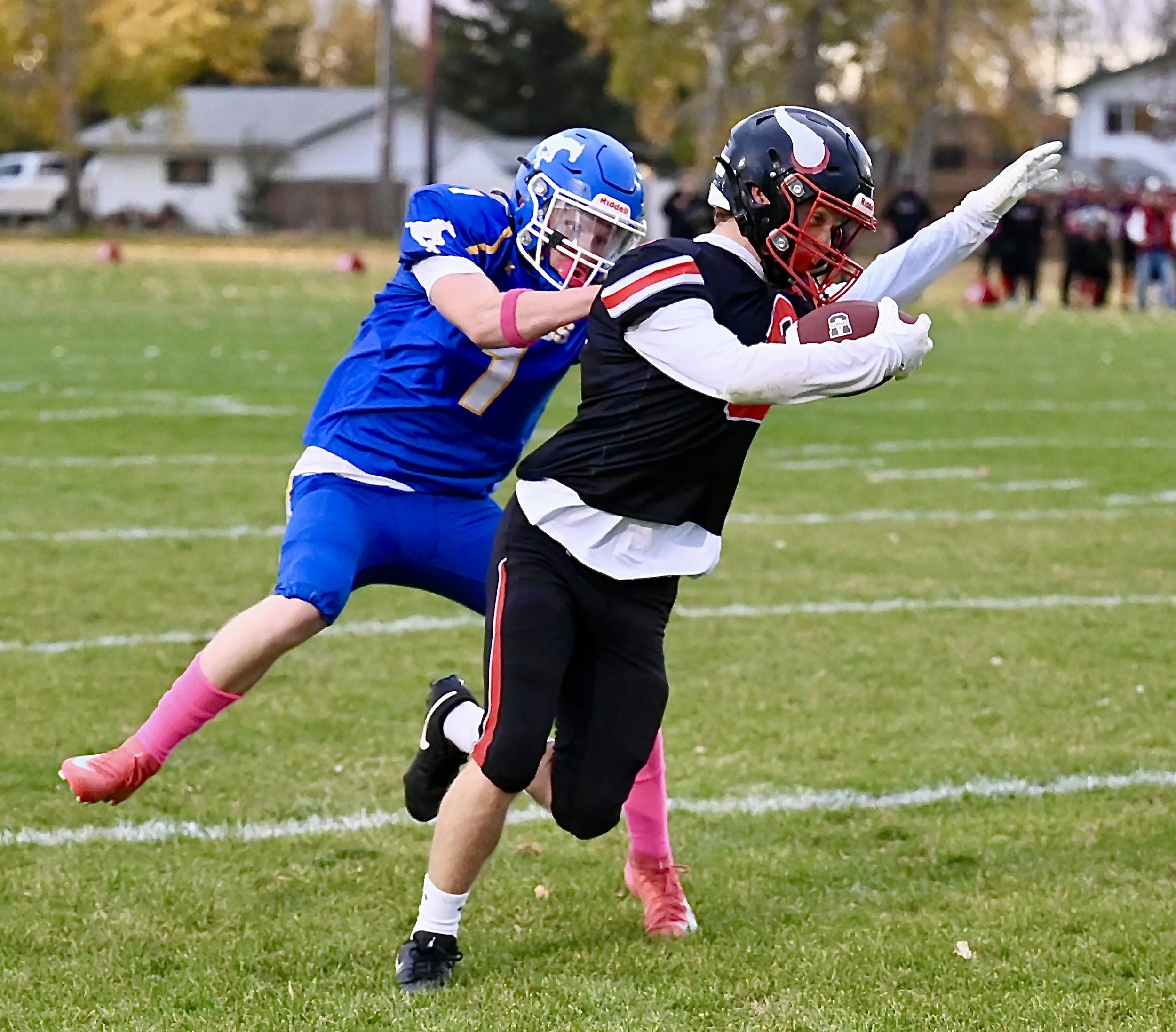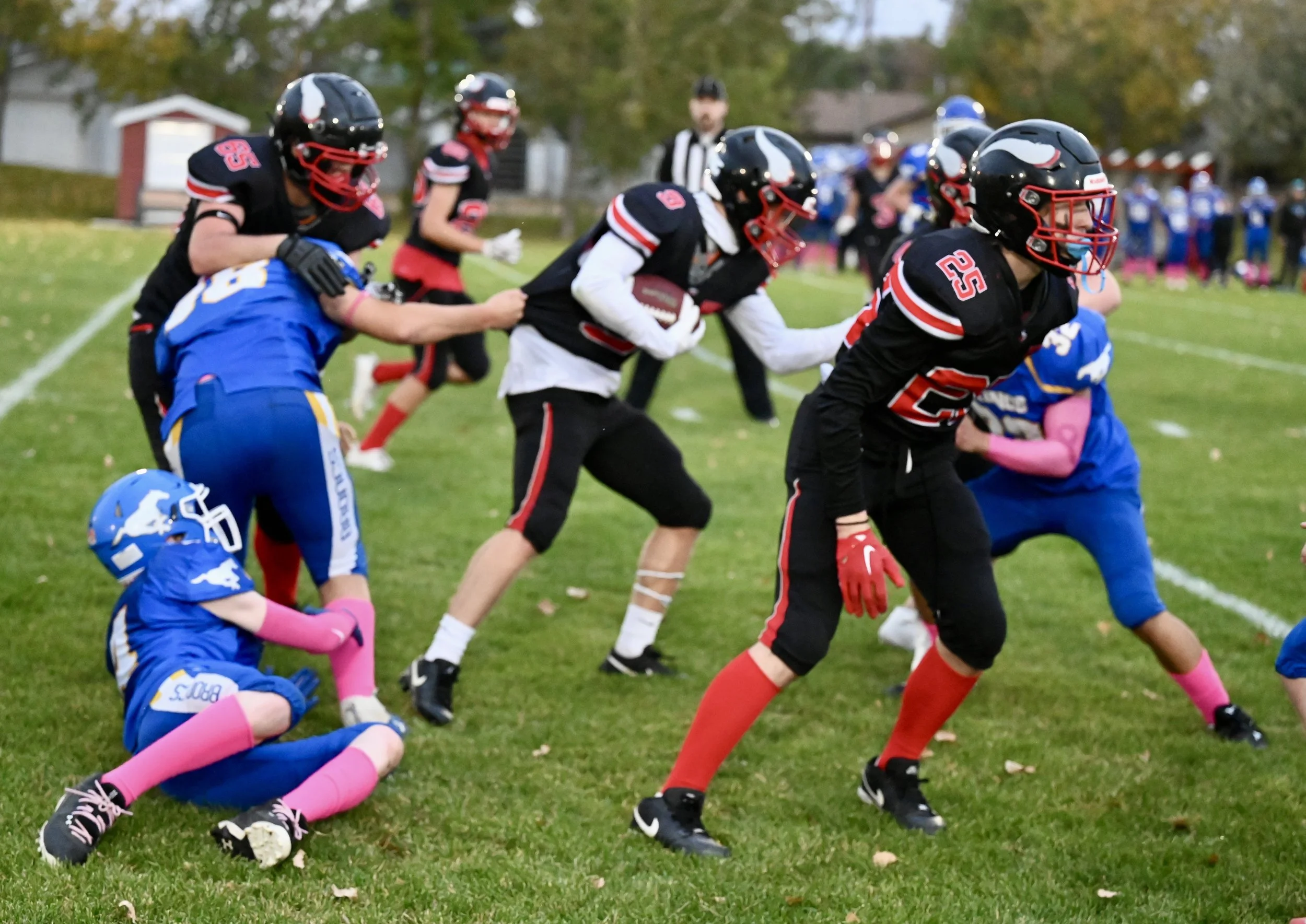 Vanier Vikings Gabe Yasinski (foreground) is horse collar tackled by the Broncs Jody Poelen - MJ Independent photo