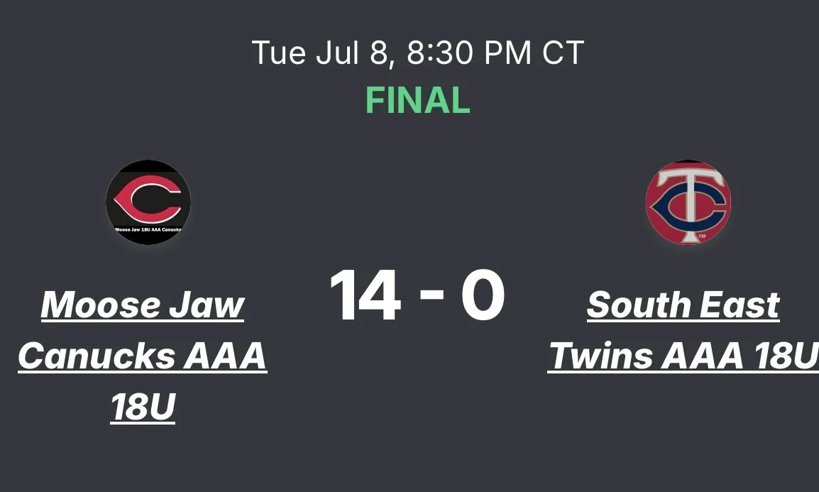 The Canucks won the second game of the doubleheader 14 - 0 over the South East Twins
