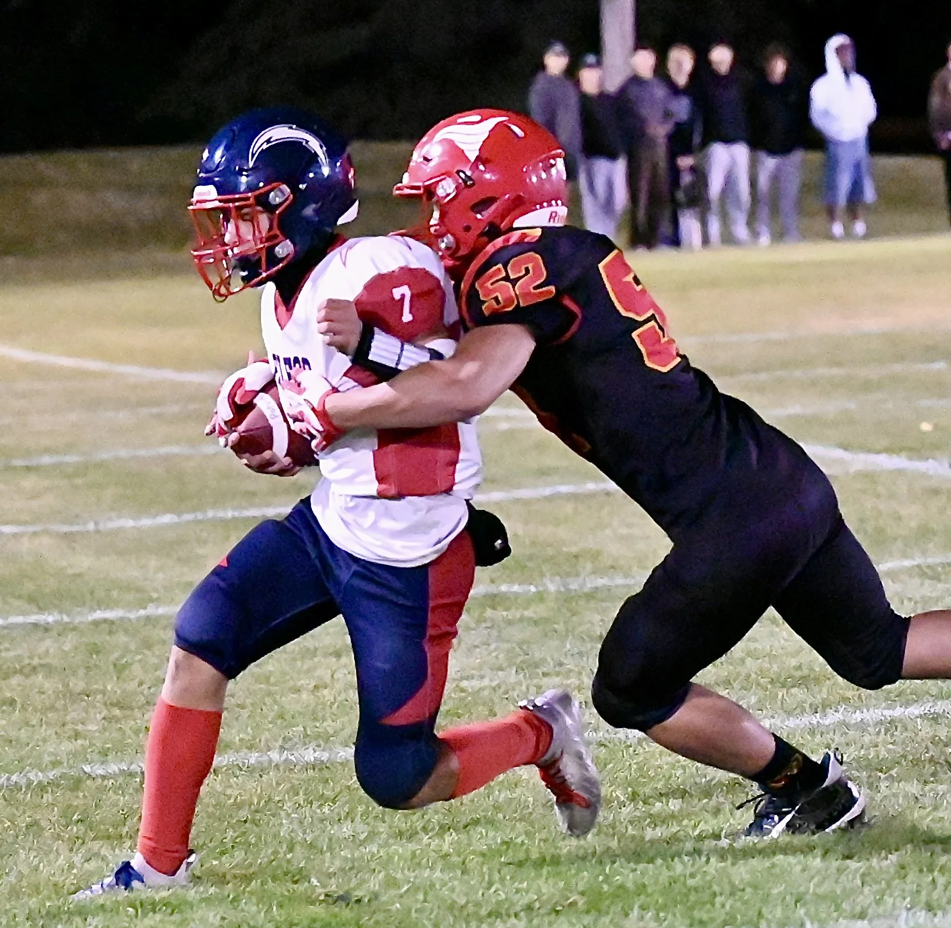 Central Cyclones linebacker Draven Smith (right) grabs Estevan Elecs quarterback Hugh Ross - MJ Independent photo