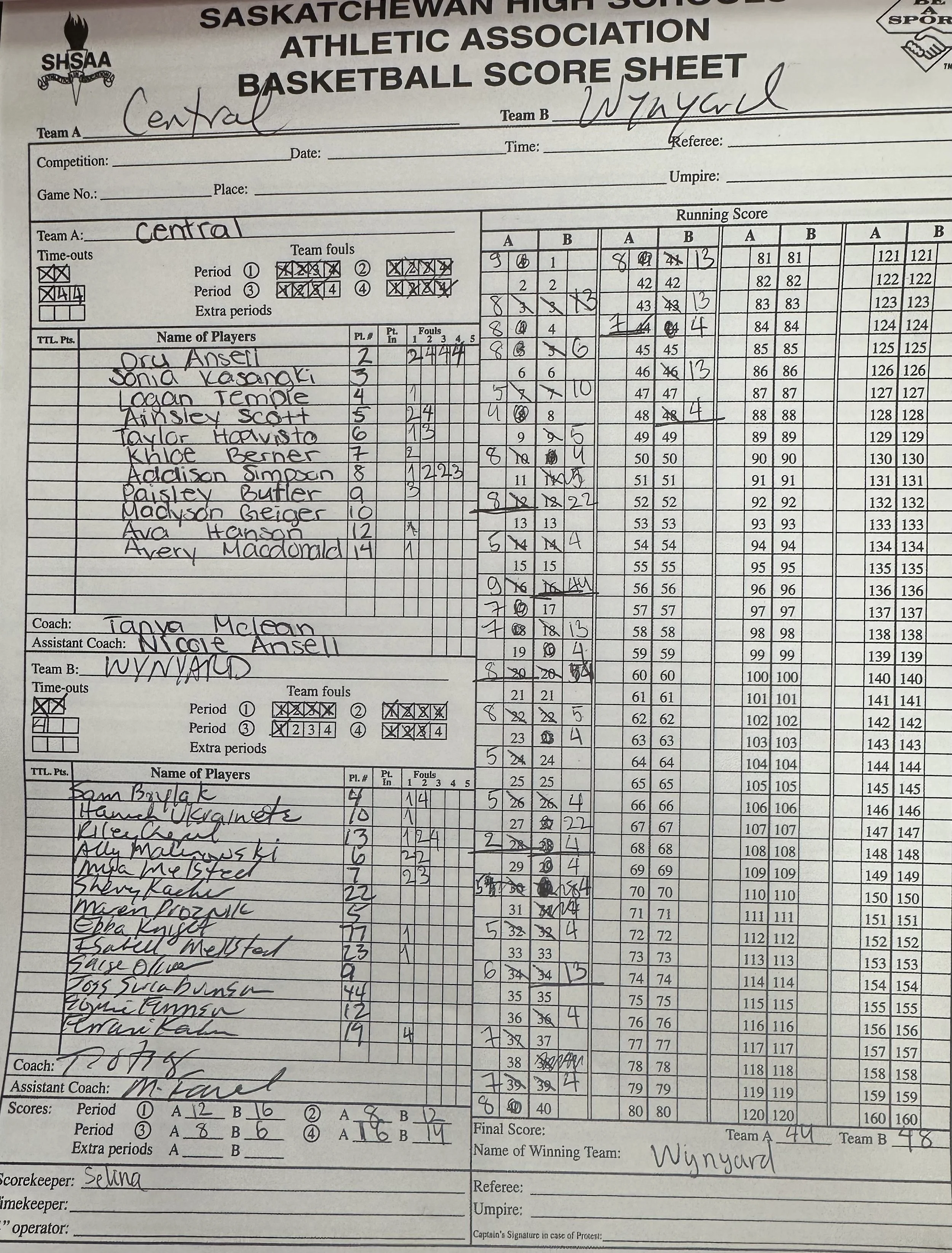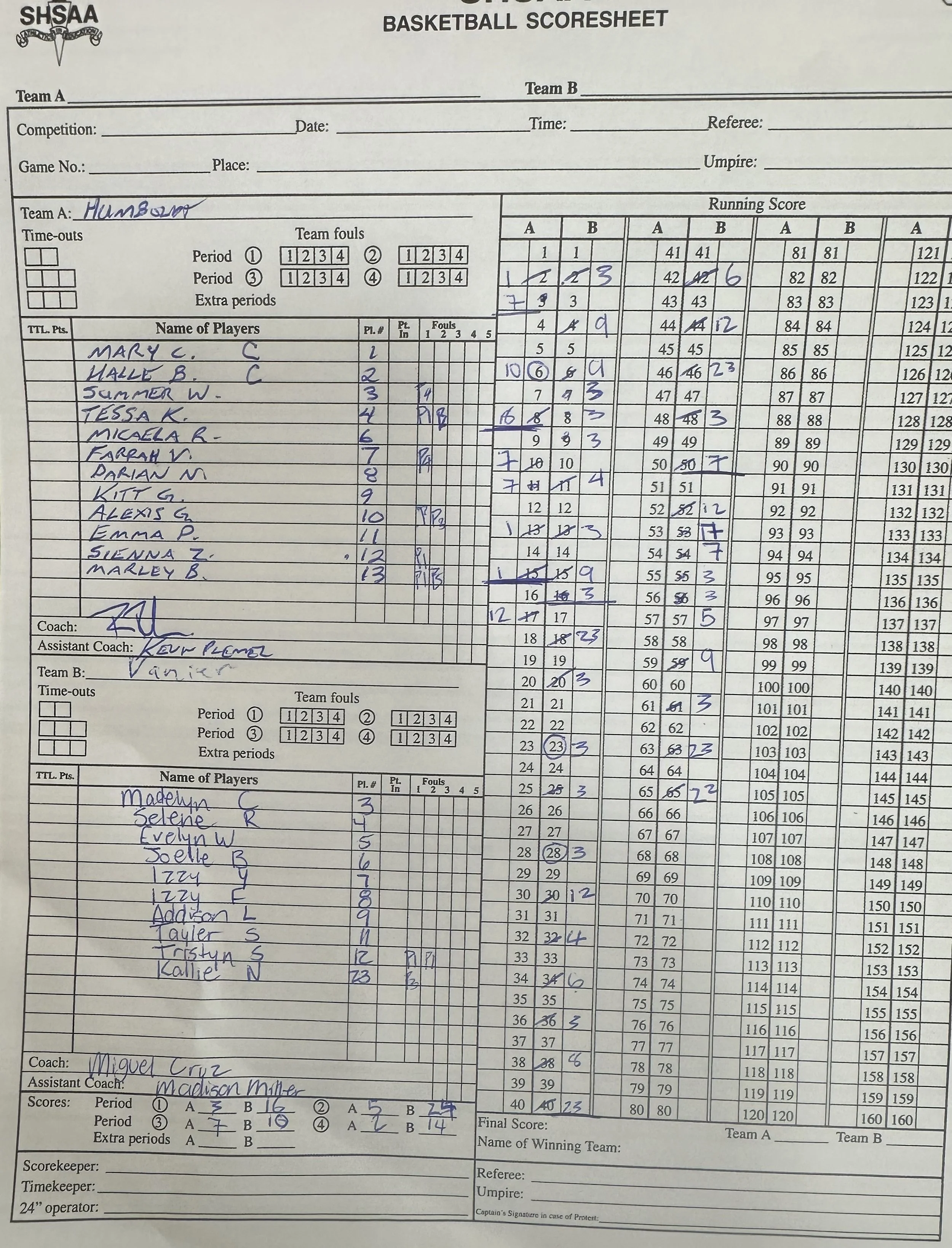 The first quarter score was Vanier 16 and Humboldt 3.
