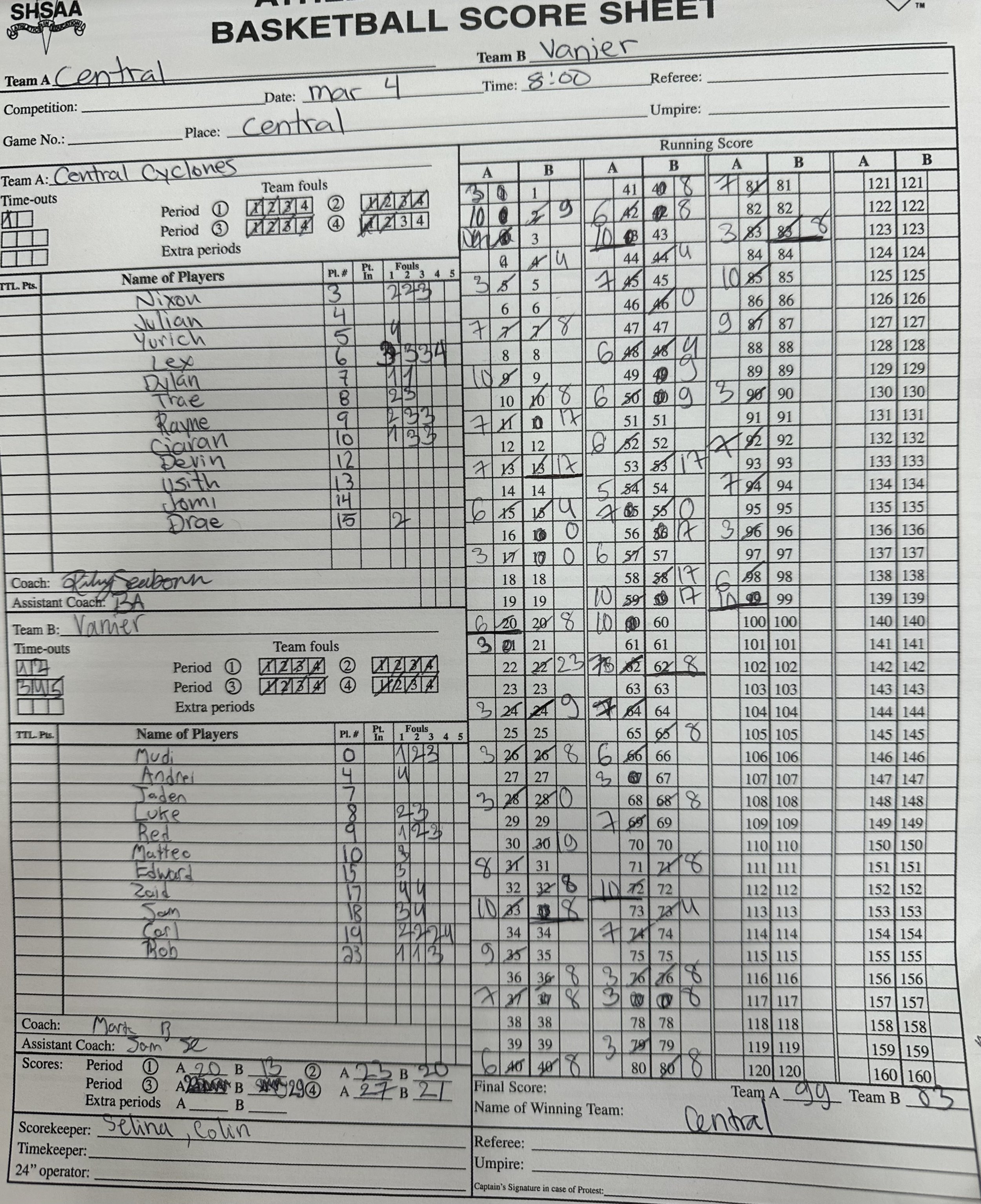 The Vanier bench, like the Central bench, was emotional and loud especially during the see saw sections of the game. Vanier had a large crowd out that was loud from start to finish.